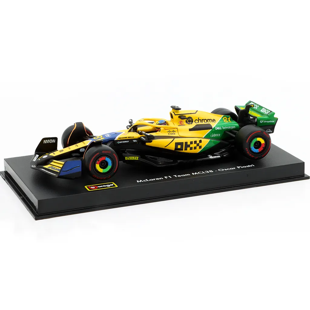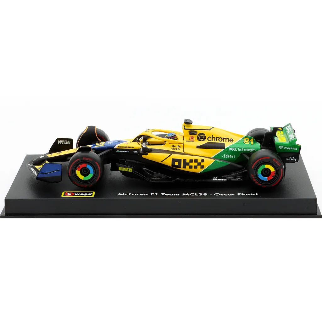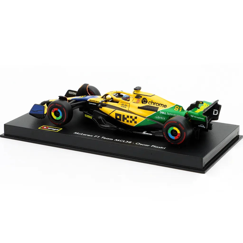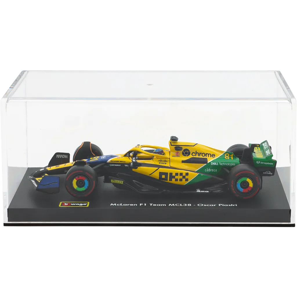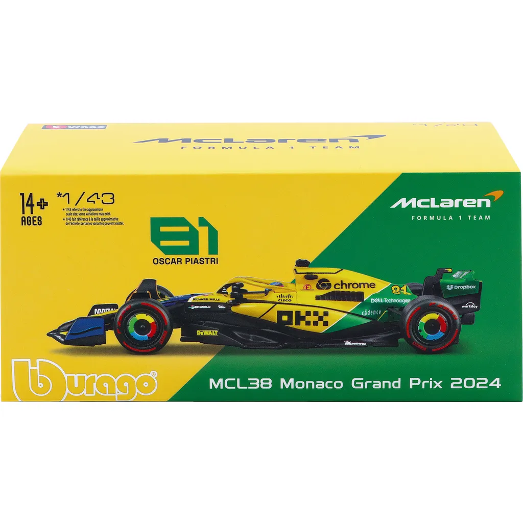 McLaren MCL38 med nummer 81 blev kørt af Oscar Piastri under Monacos Grand Prix i 2024. Denne modelbil er lavet af Bburago i skala 1:43, hvilket betyder, at den er 13 cm lang. Bilen leveres i en showcase.
