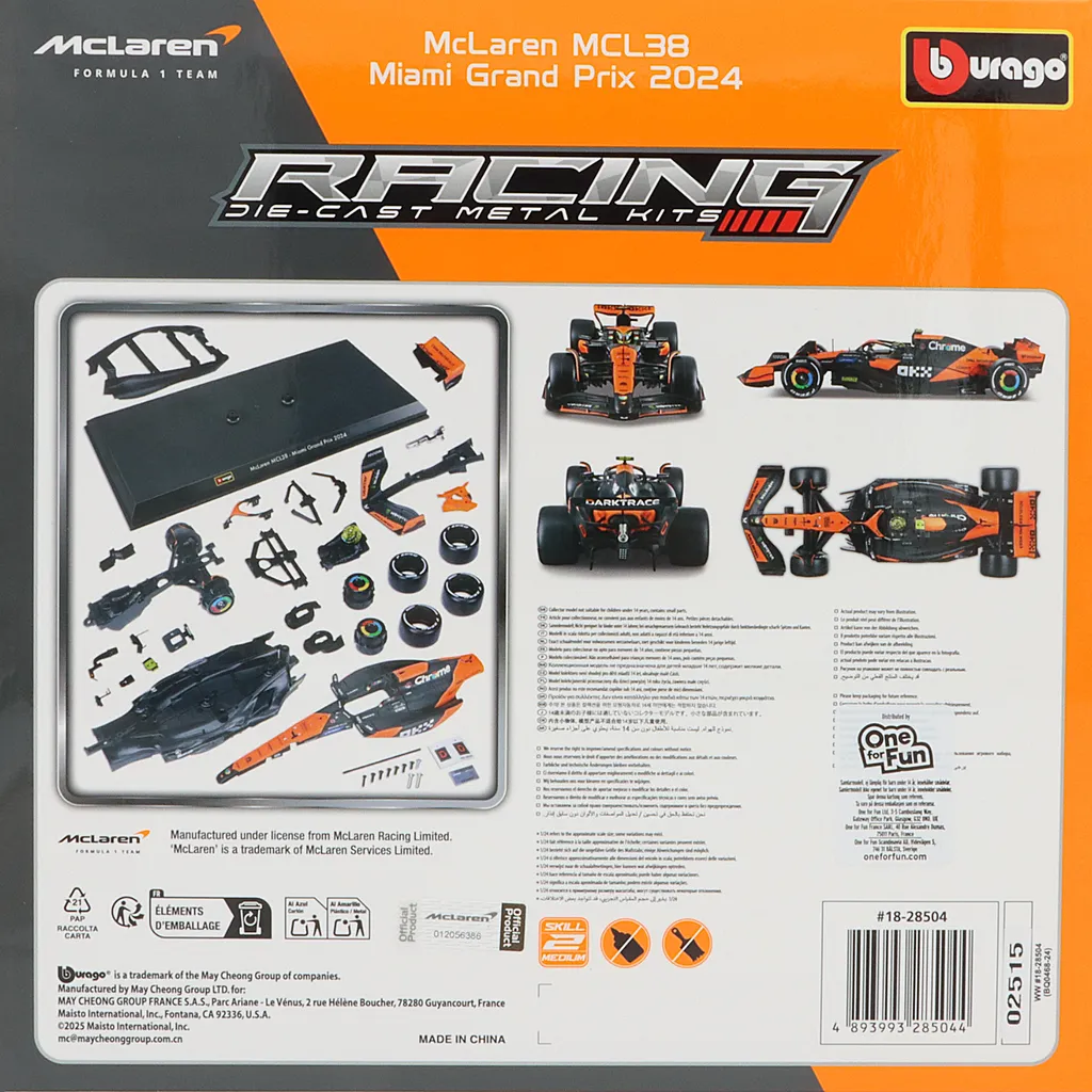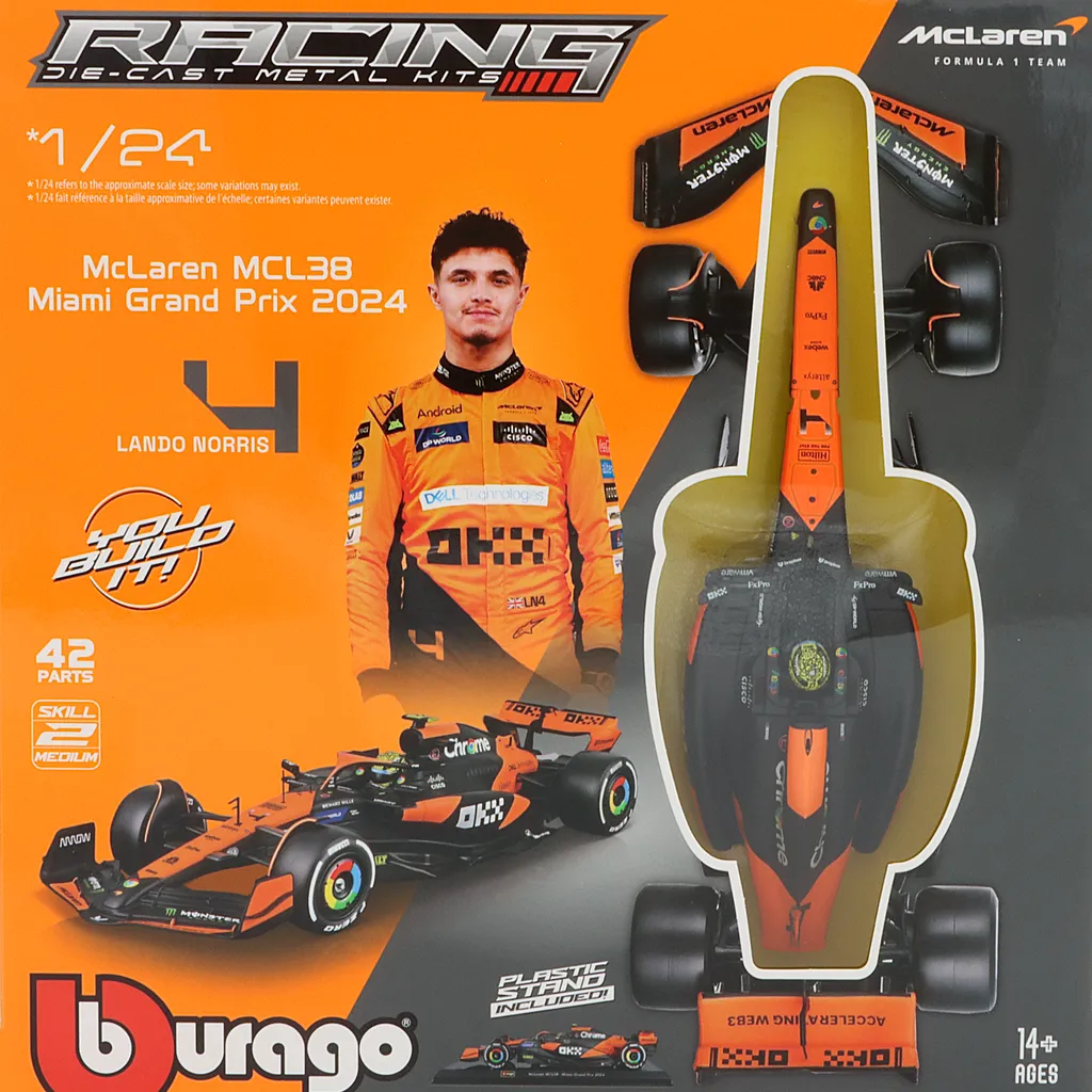 McLaren MCL38 #4 (Lando Norris) F1-bil som sæt med 44 dele fra Bburago i skala 1:24 (ca. 24 cm). Denne bil blev kørt under Miami GP, hvor Lando vandt løbet.