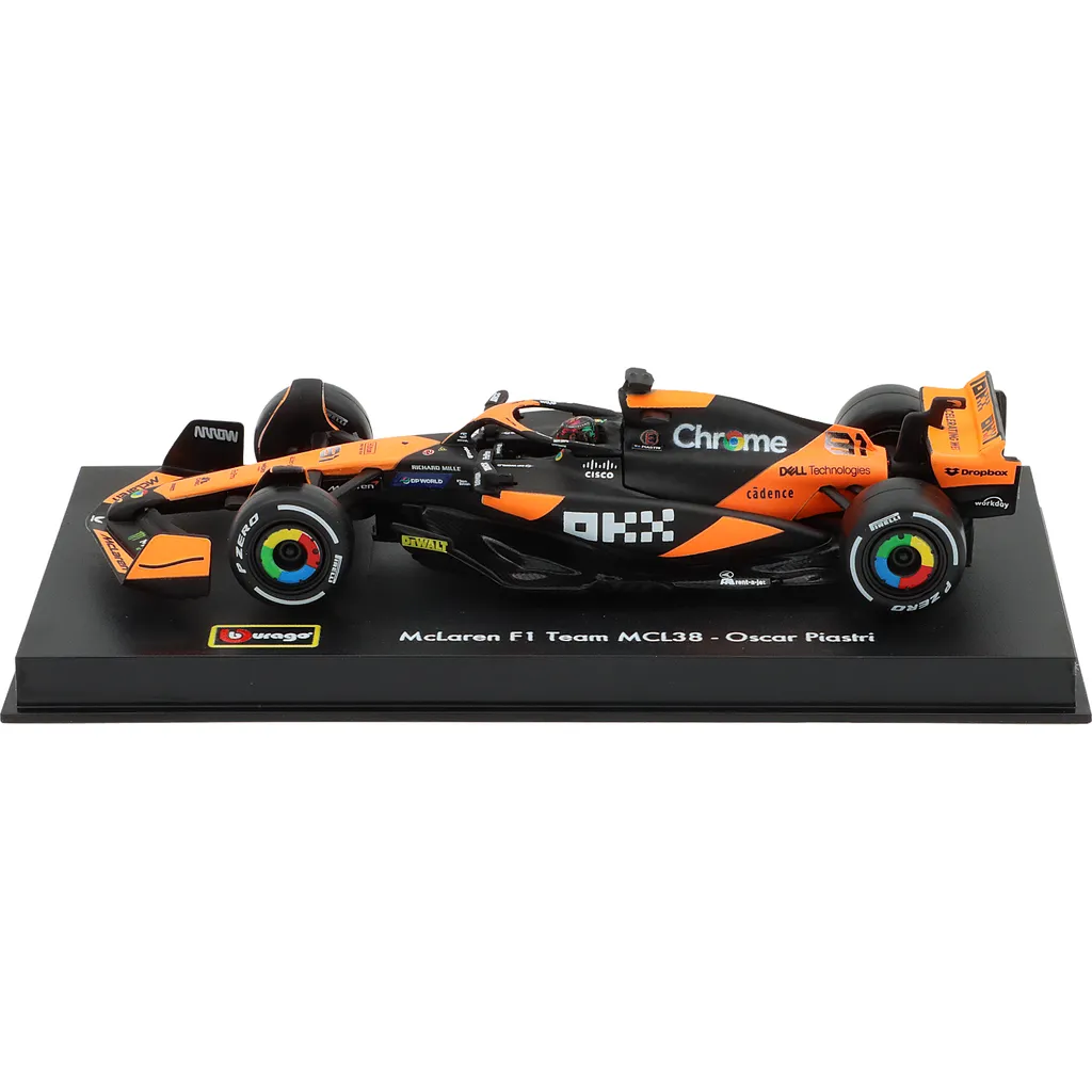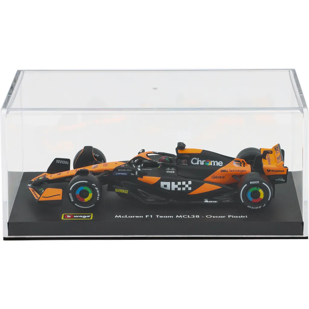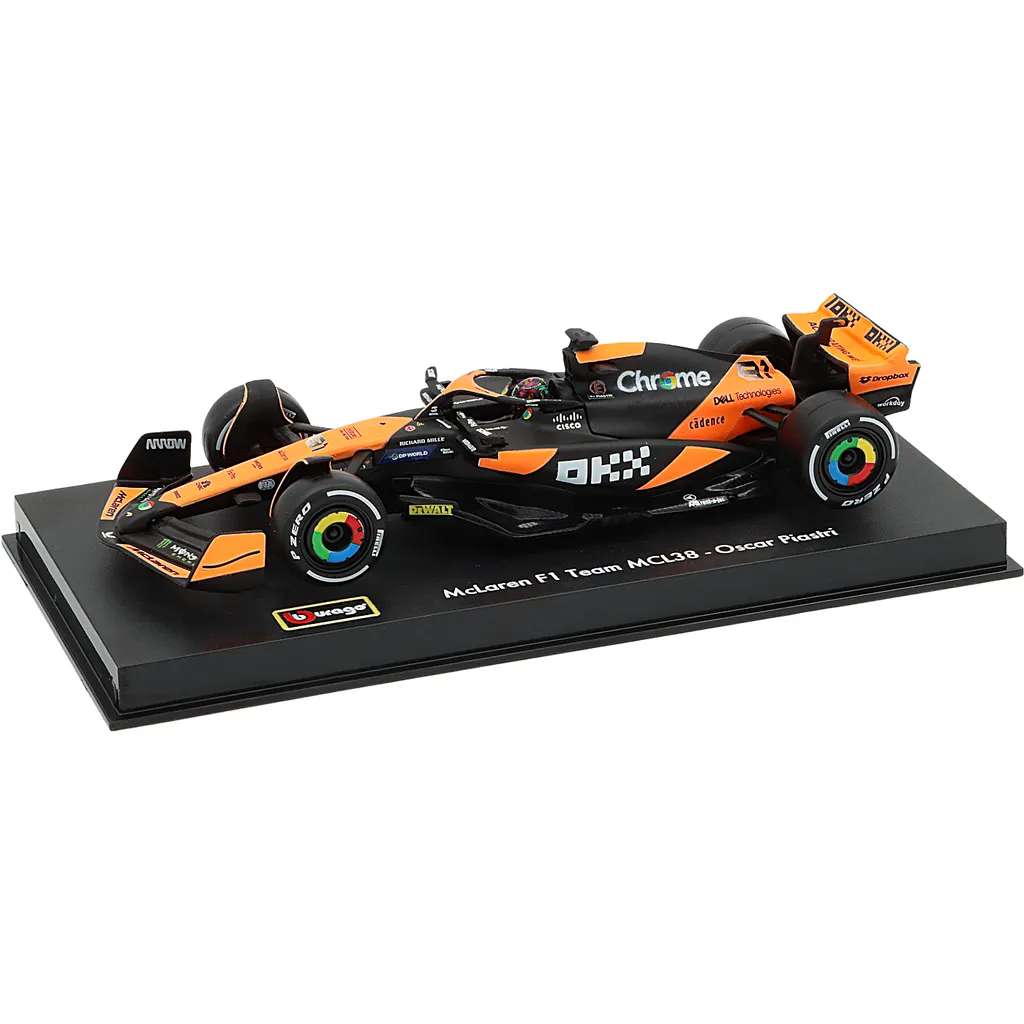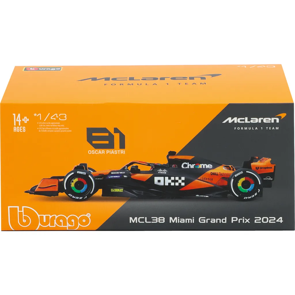 McLaren MCL38 med nummer 81 blev kørt af Oscar Piastri i F1-sæsonen 2024, og netop denne bil med denne bemaling blev kørt under Miamis GP. Legetøjsmodellen er lavet af Bburago i skala 1:43, hvilket betyder, at den er 13 cm lang. Bilen leveres i en akrylæske.