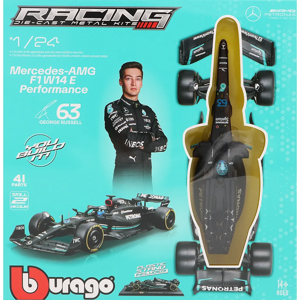 Mercedes-AMG F1 W14 E Performance #63 (George Russell) F1-bil som sæt med 44 dele fra Bburago i skala 1:24 (ca. 24 cm).