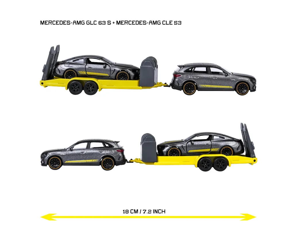 Mercedes-AMG GLC 63 S med en Mercedes-AMG CLE 53 på en trailer, begge i en flot grå farve med gule detaljer fra producenten Majorette. Hele riggen er 18 cm lang.