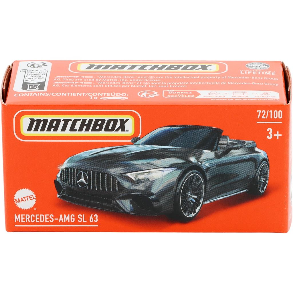 Grå (næsten sort/grå metallic) Mercedes-AMG SL 63 fra Matchbox og Power Grab-serien, hvor denne legetøjsbil er bil nummer 72/100.