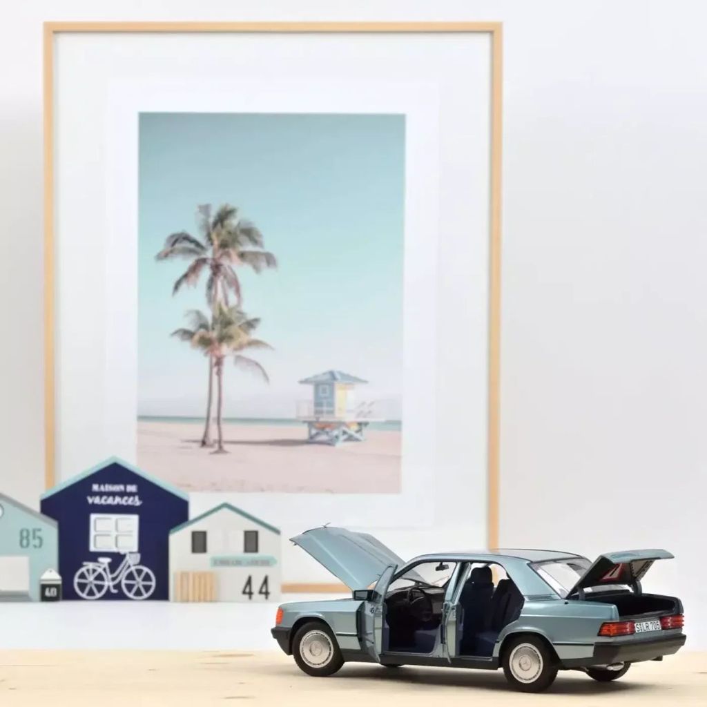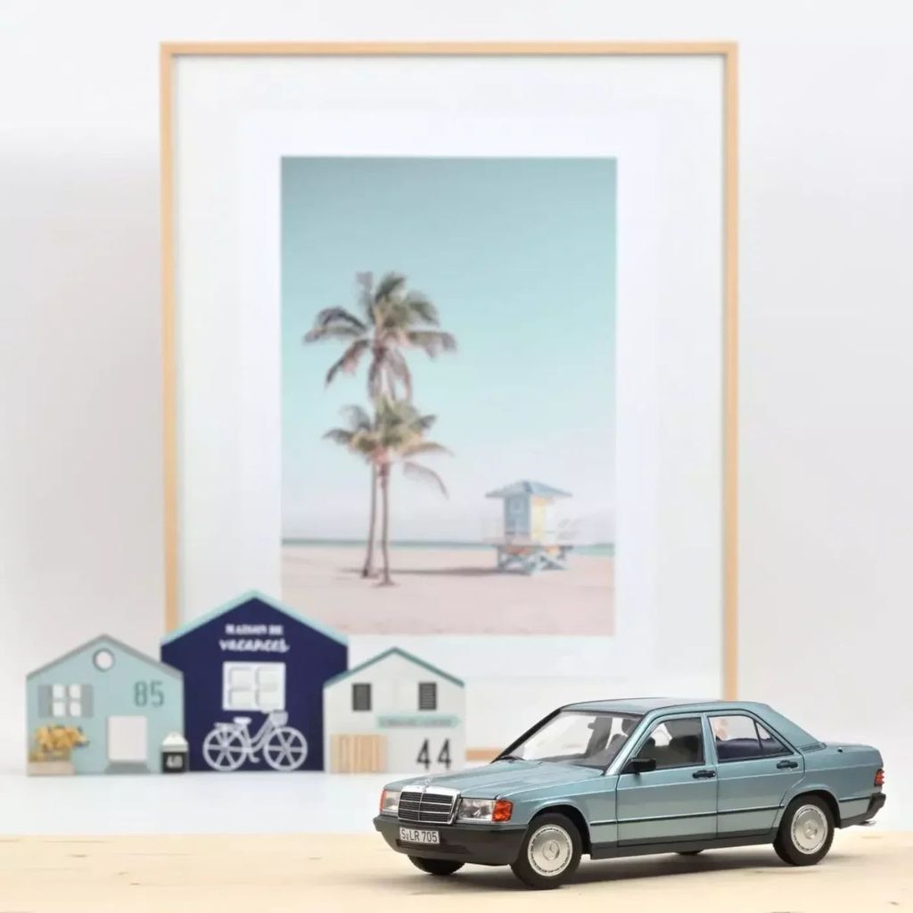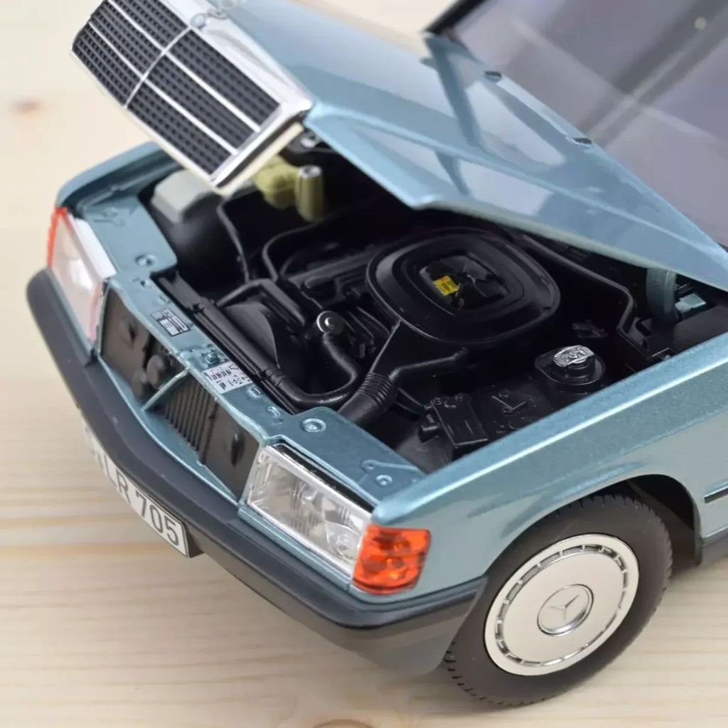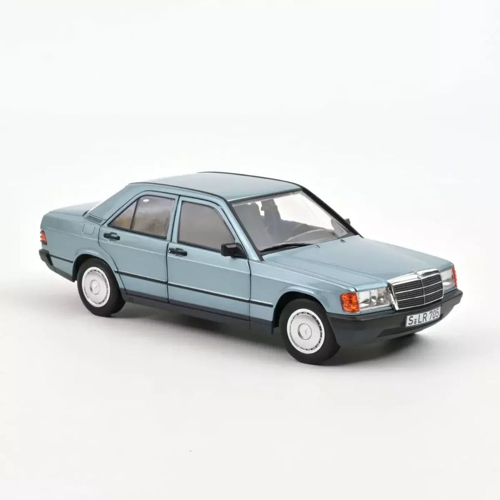 Fra franske Norev tilbyder vi denne fine model af en lyseblå (metallak) Mercedes-Benz 190 E (W201), modelår 1984, i skala 1:18 (24 cm).