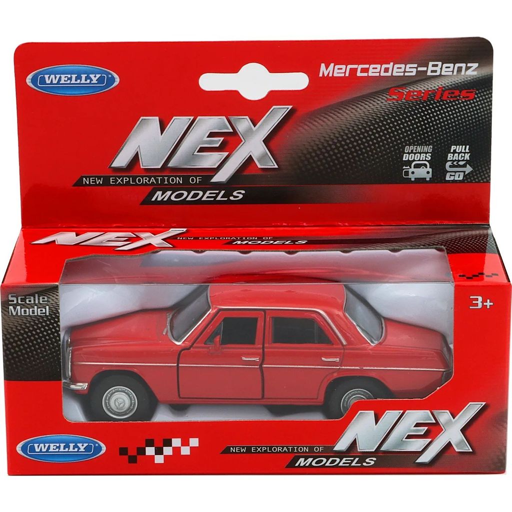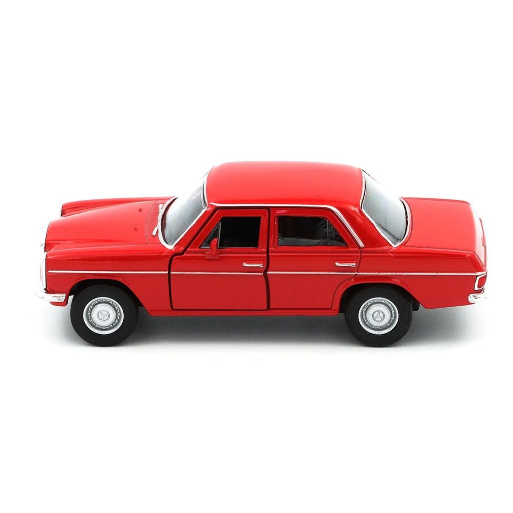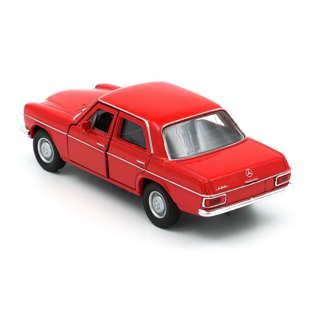 Rød Mercedes-Benz 220 (W115) fra Welly i skala 1:34 (11 cm) med pullback. Bilen er i metal og anbefales fra 3 år.