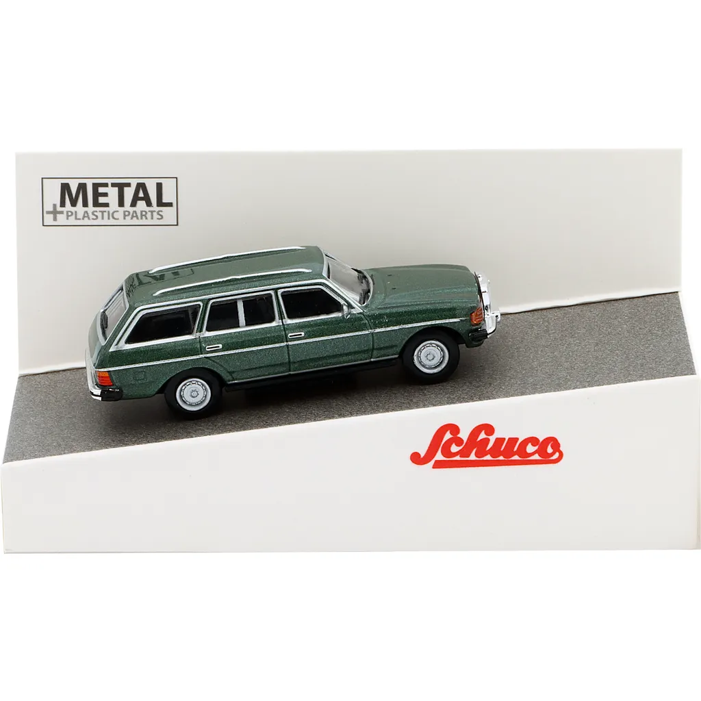 En grøn Mercedes-Benz 280TE (S123), modelår 1982, fra producenten Schuco i skala 1:87 (5,5 cm).