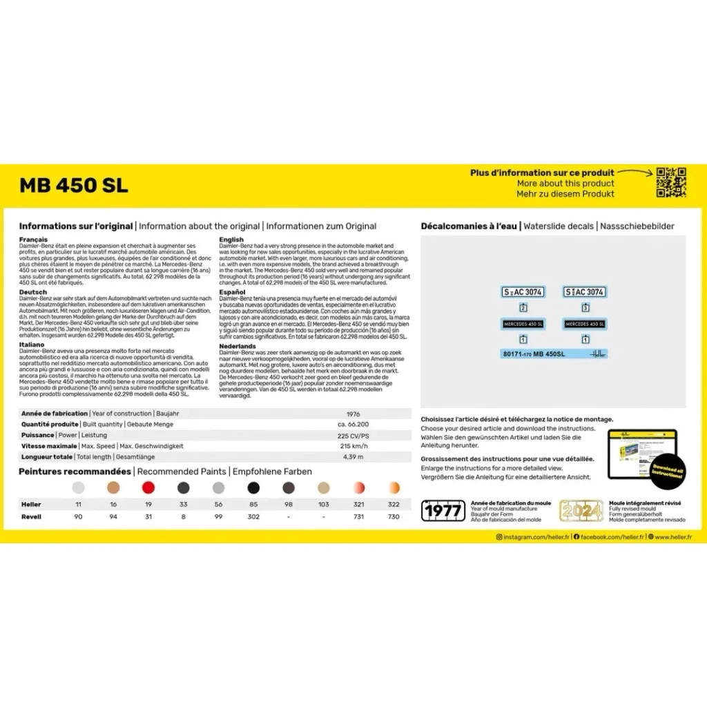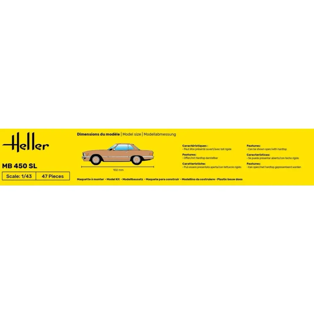 Mercedes-Benz 450 SL som plastiksæt fra den franske producent Heller. Den færdige bil er 10,2 cm lang og 4,1 cm bred. Skala 1:43.