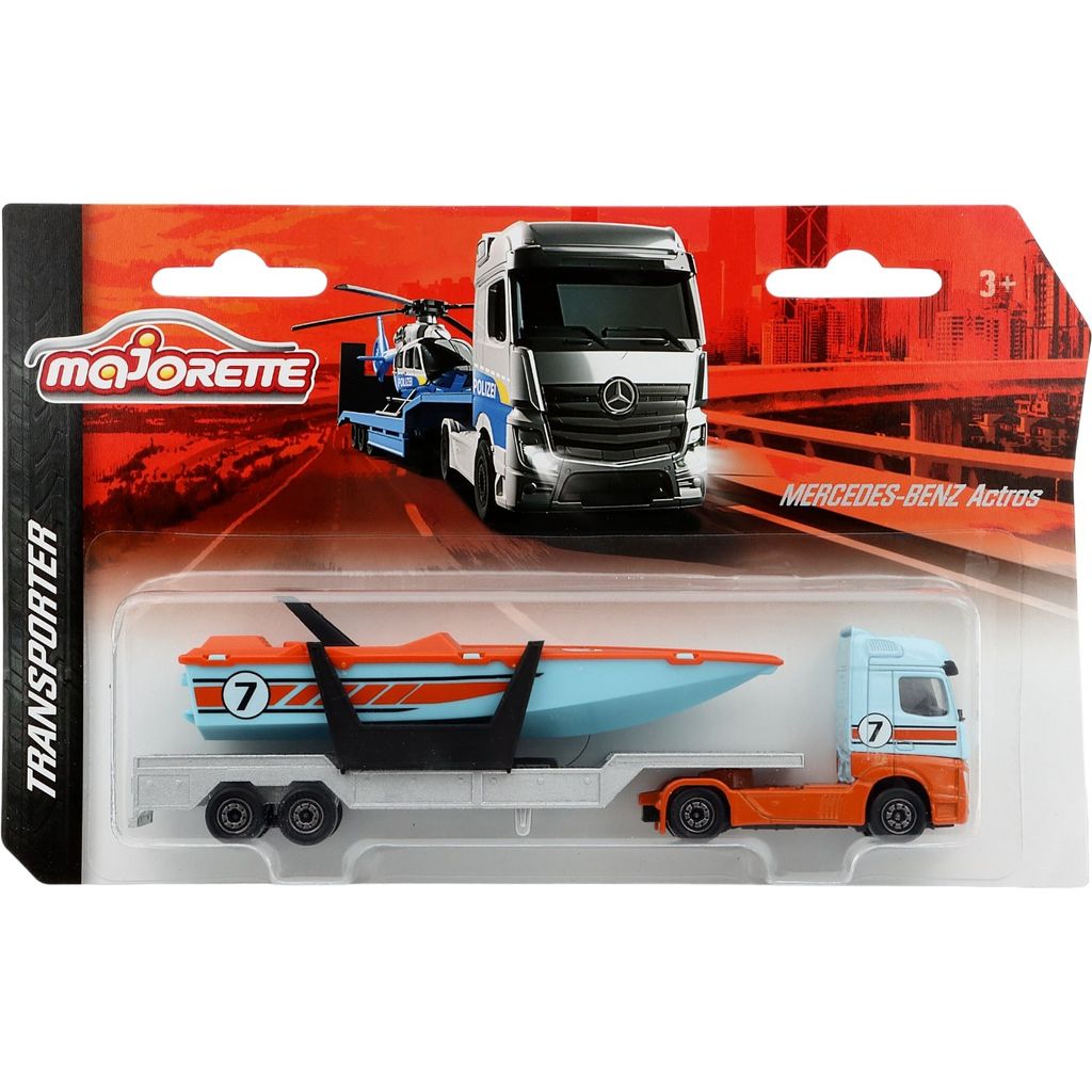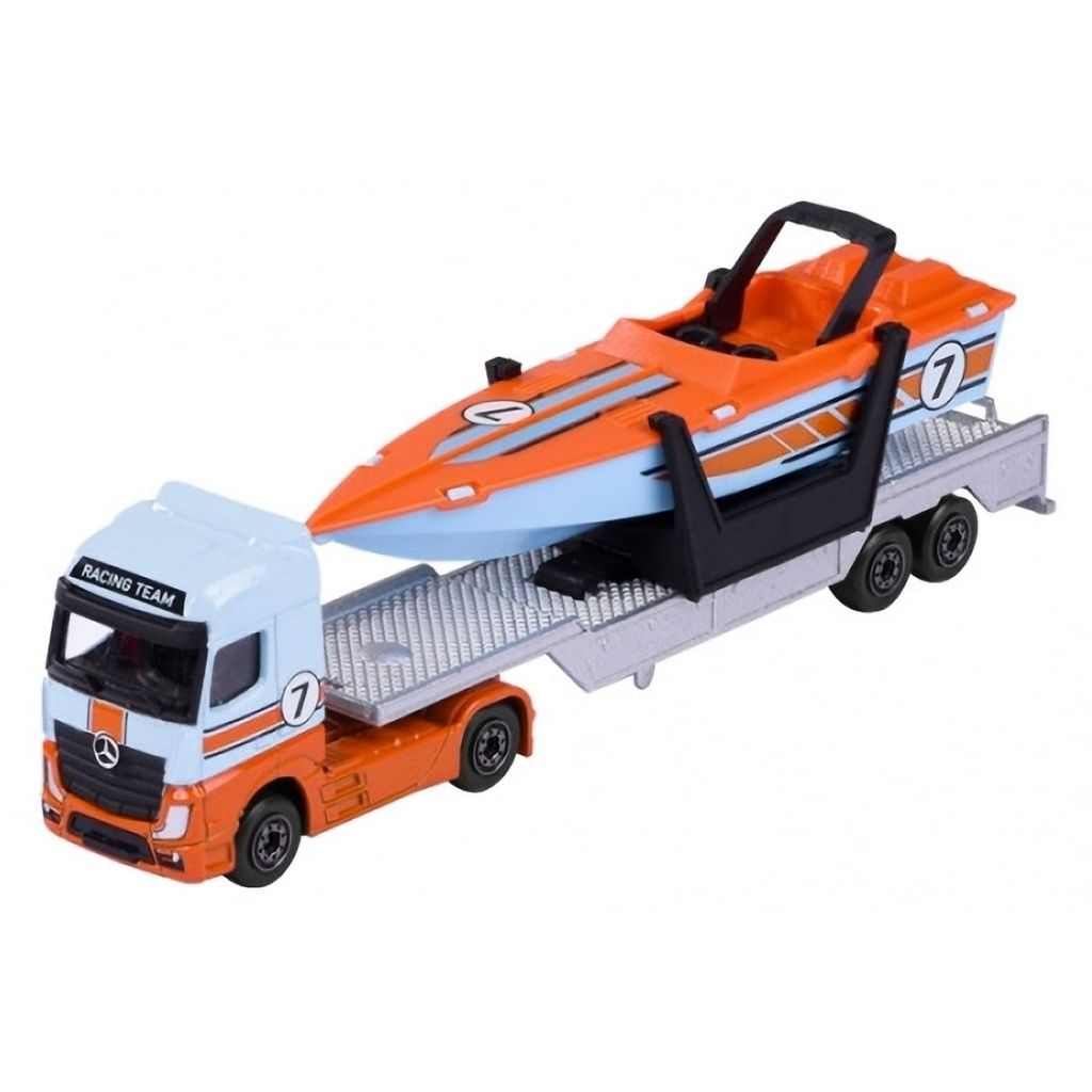 Fra Majorette og deres Transporter-serie kommer denne lyseblå og orange Mercedes-Benz Actros, der trækker en trailer med sportsbåd.