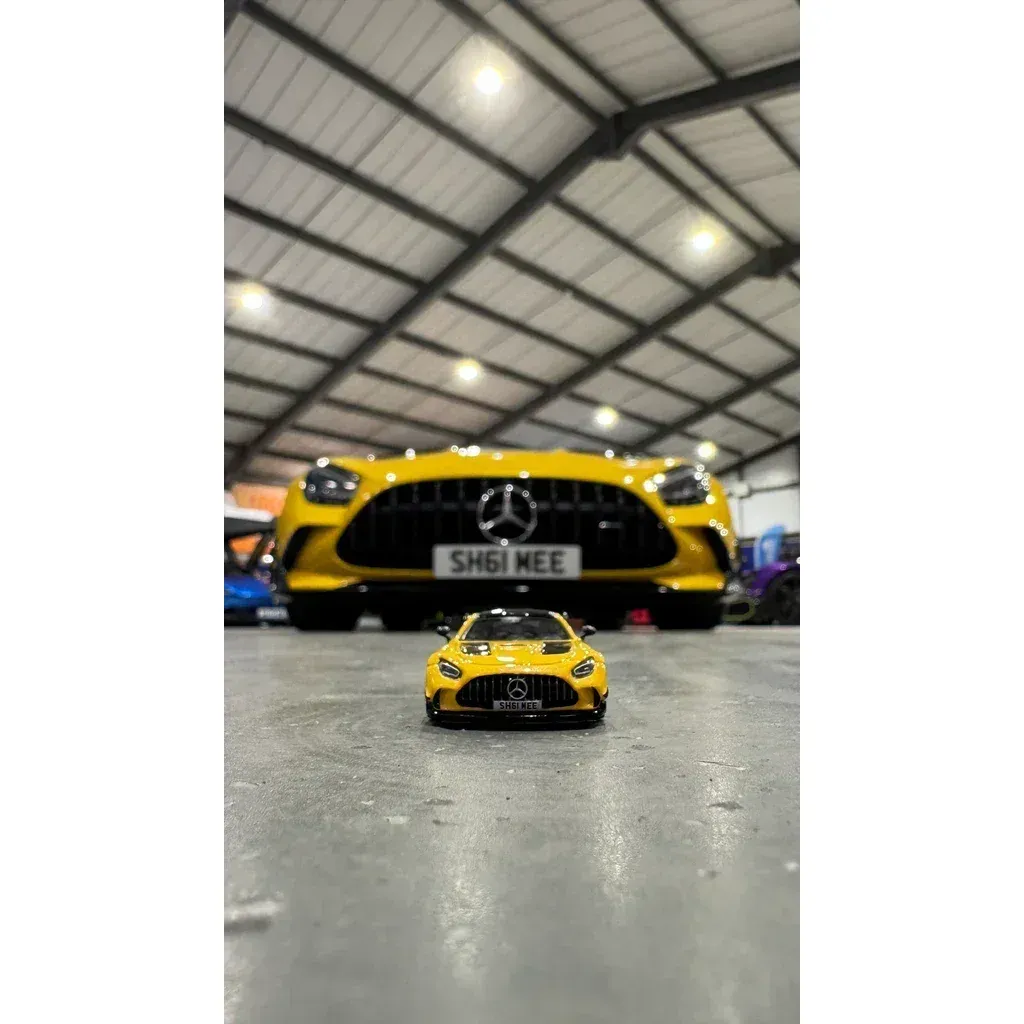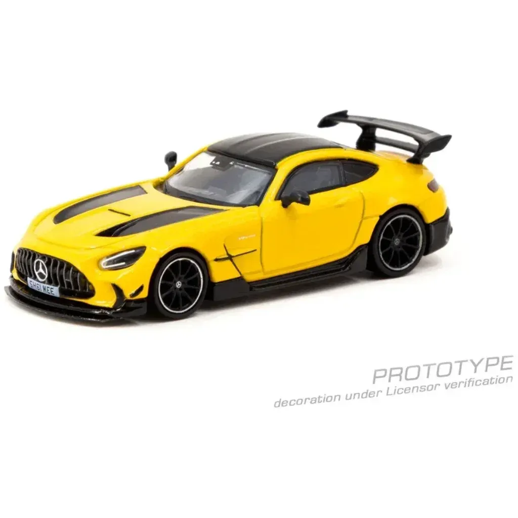 Shmees (Timothy John Burton) Mercedes-Benz AMG GT Black Series i gul og sort. Modellen er fremstillet af Tarmac Works i skala 1:64 (ca. 7 cm) og er en del af Tarmacs GLOBAL64-serie.