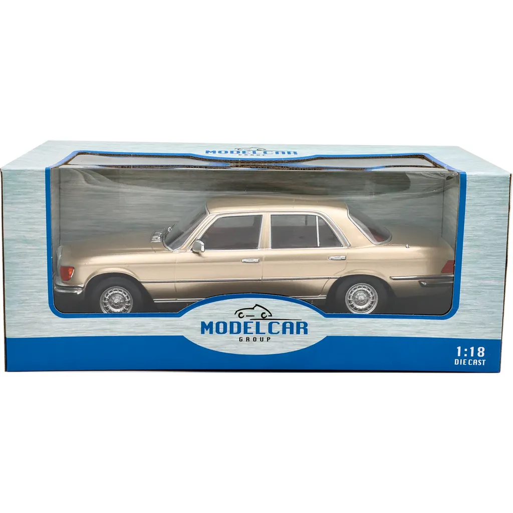 Mercedes-Benz S-Klasse (W116) i beige (gyldenbeige), modelår 1972, som model fra Modelcar Group. Modelbilen er i skala 1:18 (28 cm).