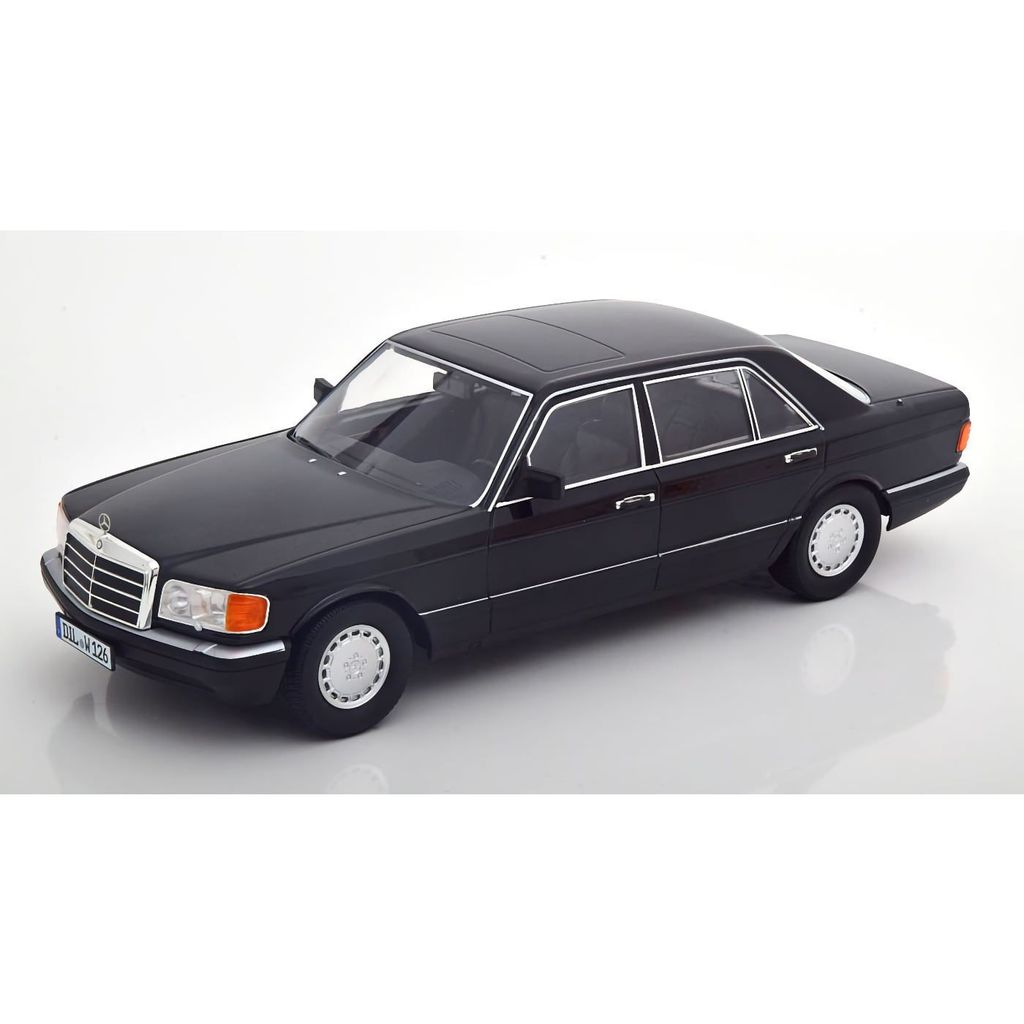 Model fra det tyske modelbilfirma iScale i skala 1:18. Bilen er en sort Mercedes S-klasse W126 modelår 1985.