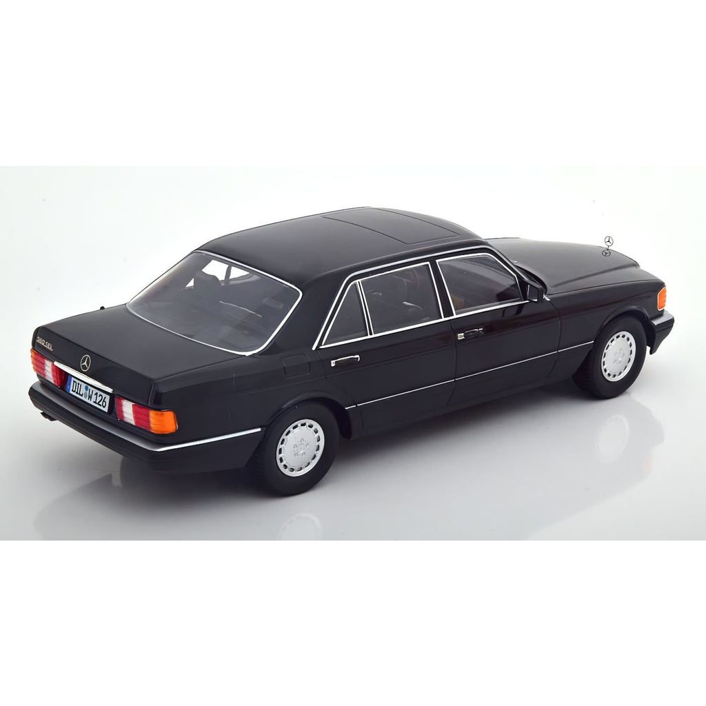 Model fra det tyske modelbilfirma iScale i skala 1:18. Bilen er en sort Mercedes S-klasse W126 (560 SEL Facelift 2) modelår 1985.