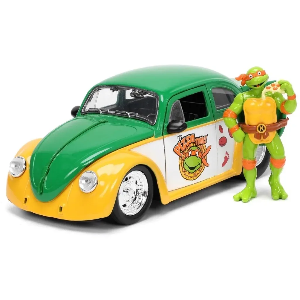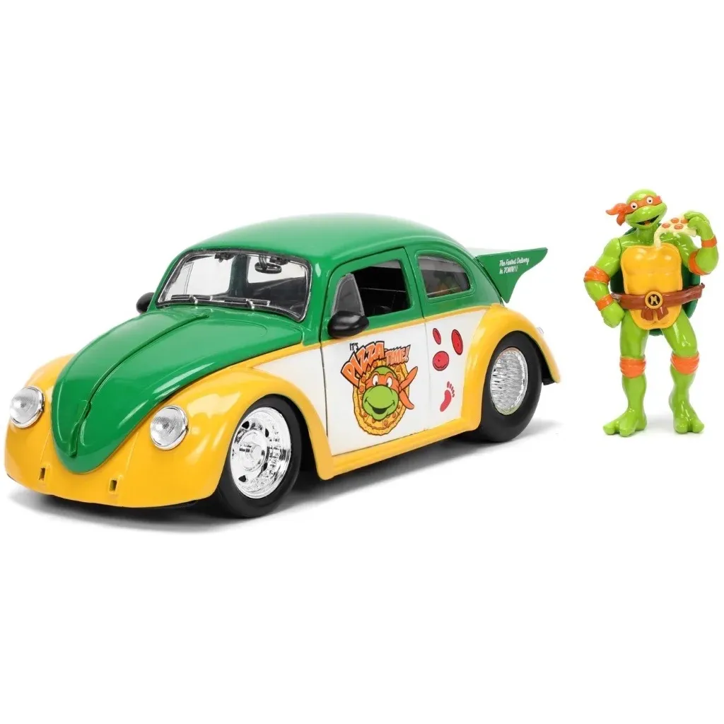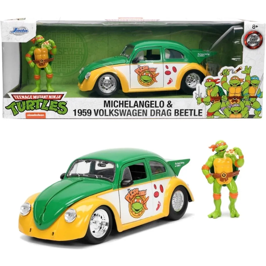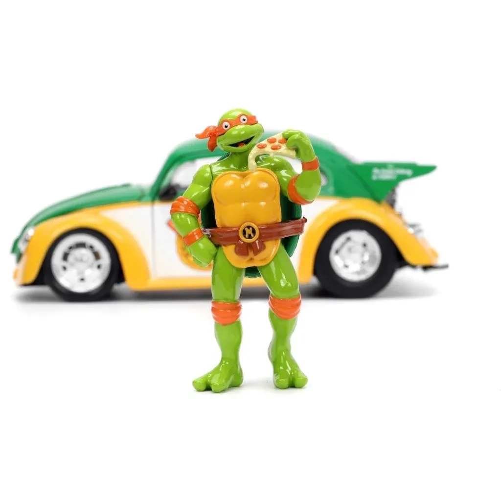 Skildpadden Michelangelo med en Volkswagen Drag Beetle fra 1959 fra Jada Toys i skala 1:24 (18 cm).