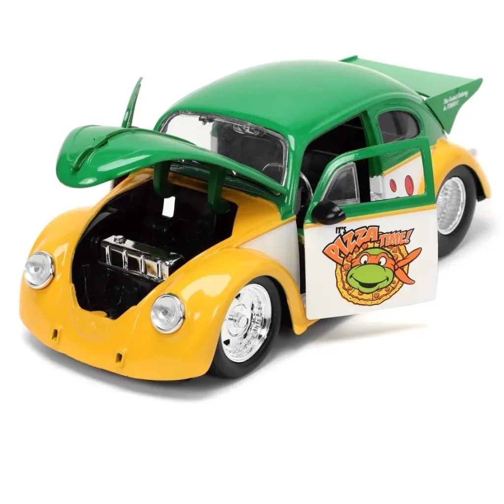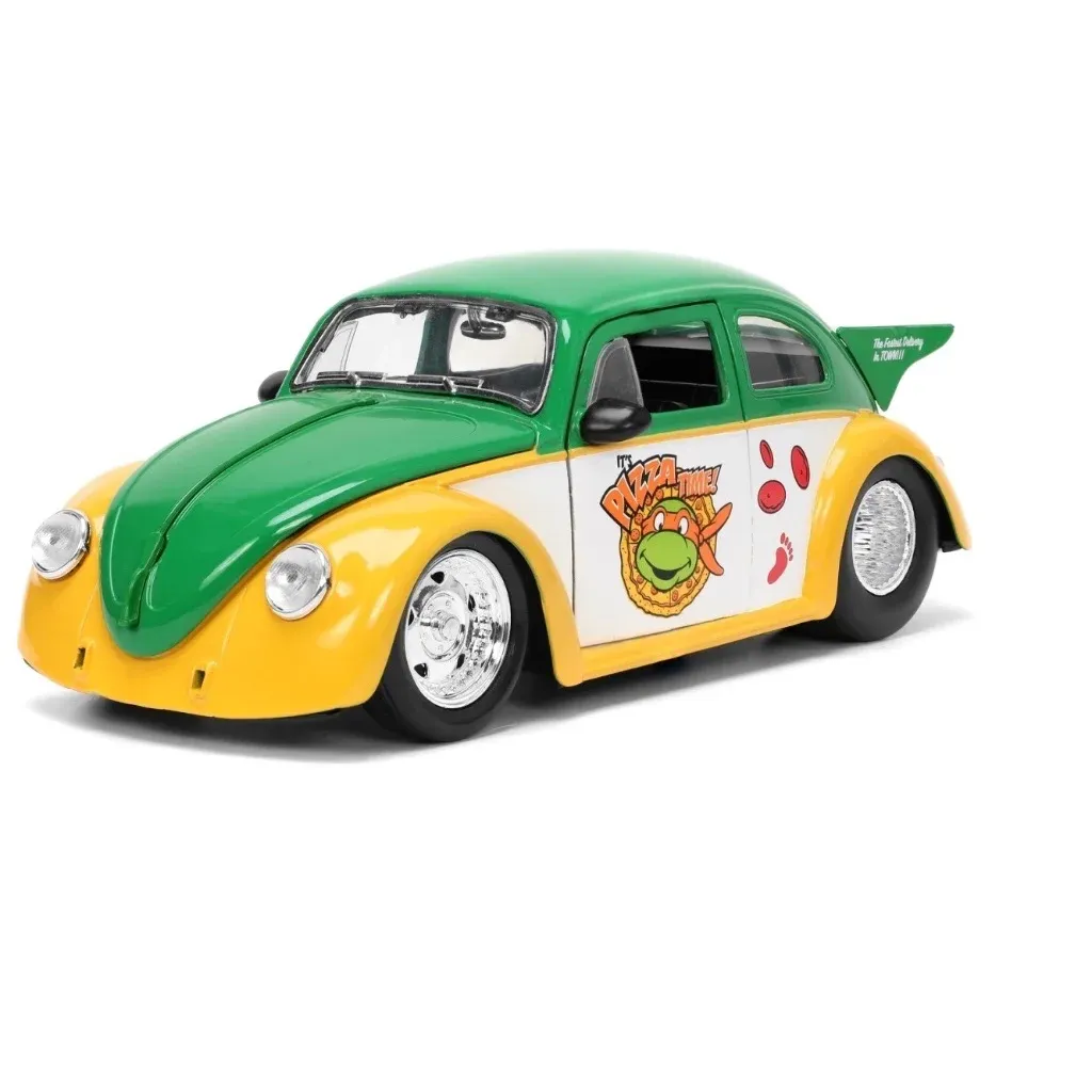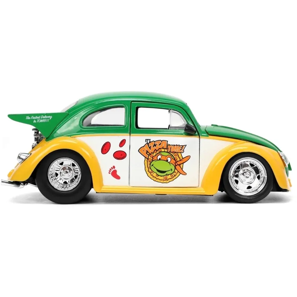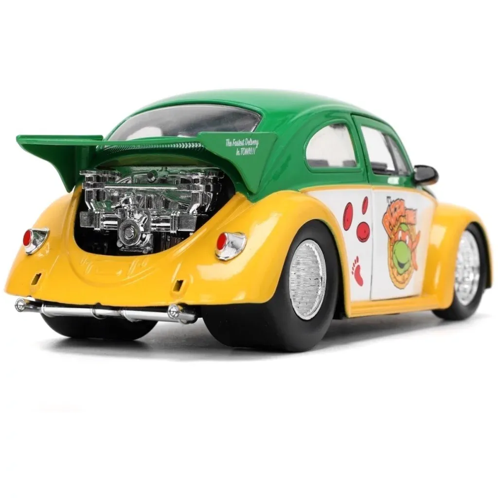 Skildpadden Michelangelo med en Volkswagen Drag Beetle fra 1959 fra Jada Toys i skala 1:24 (18 cm).