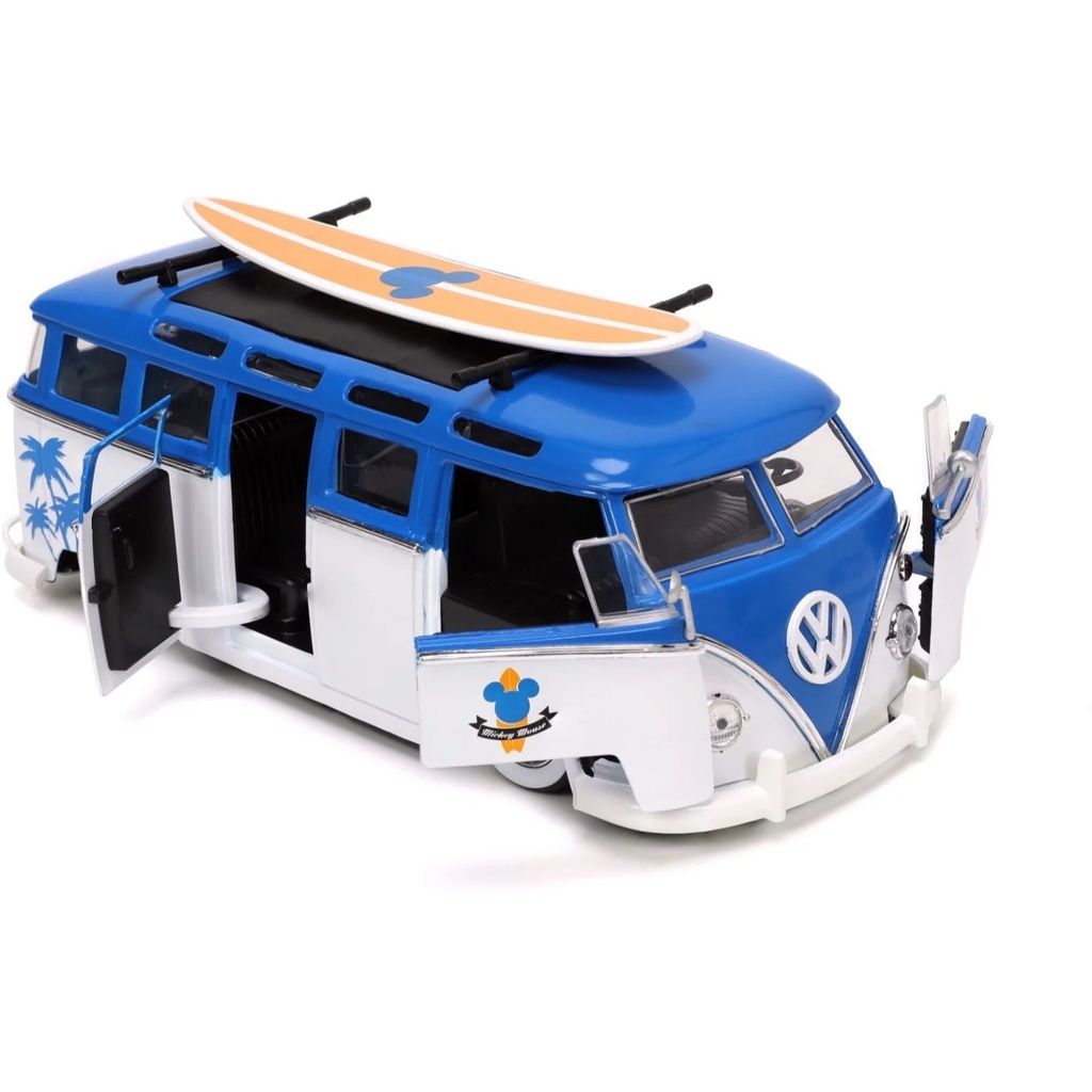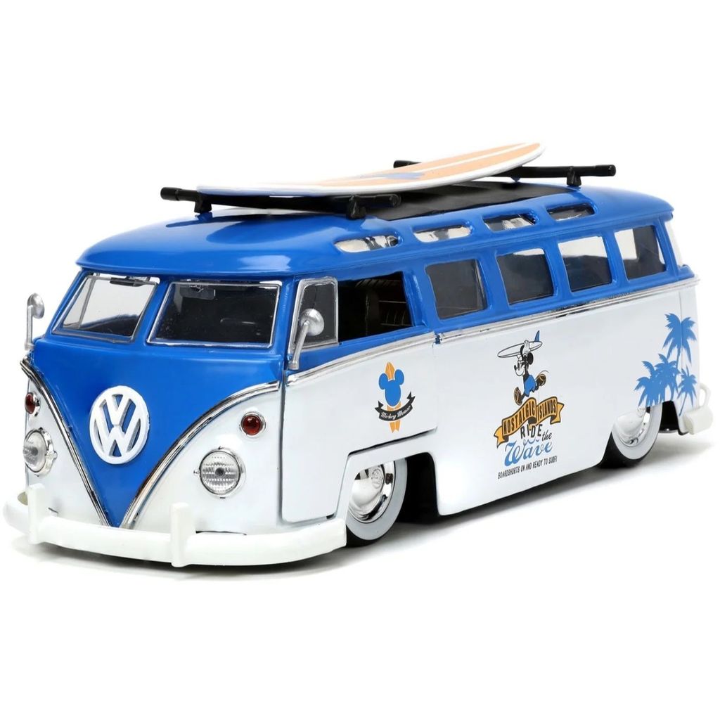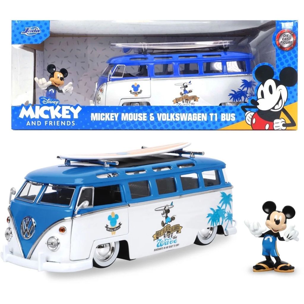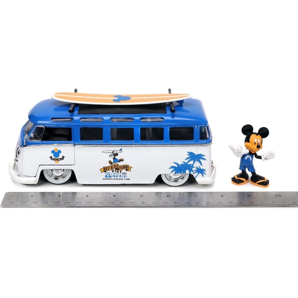 Mickey Mouse, eller Mickey Mouse, sammen med en hvid og blå Volkswagen T1 Bus med aftageligt surfbræt på taget. Bilen er i skala 1:24 og er ca. 20 cm lang.