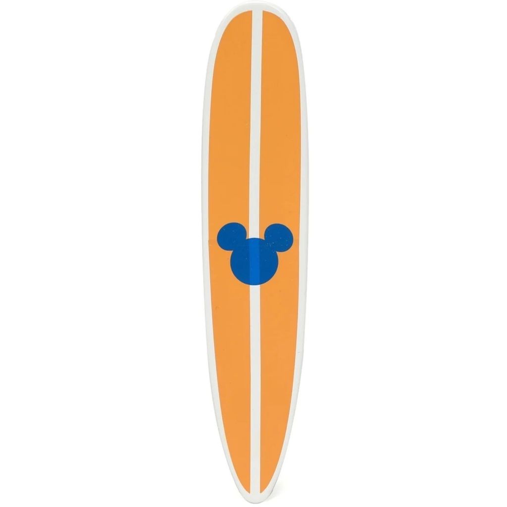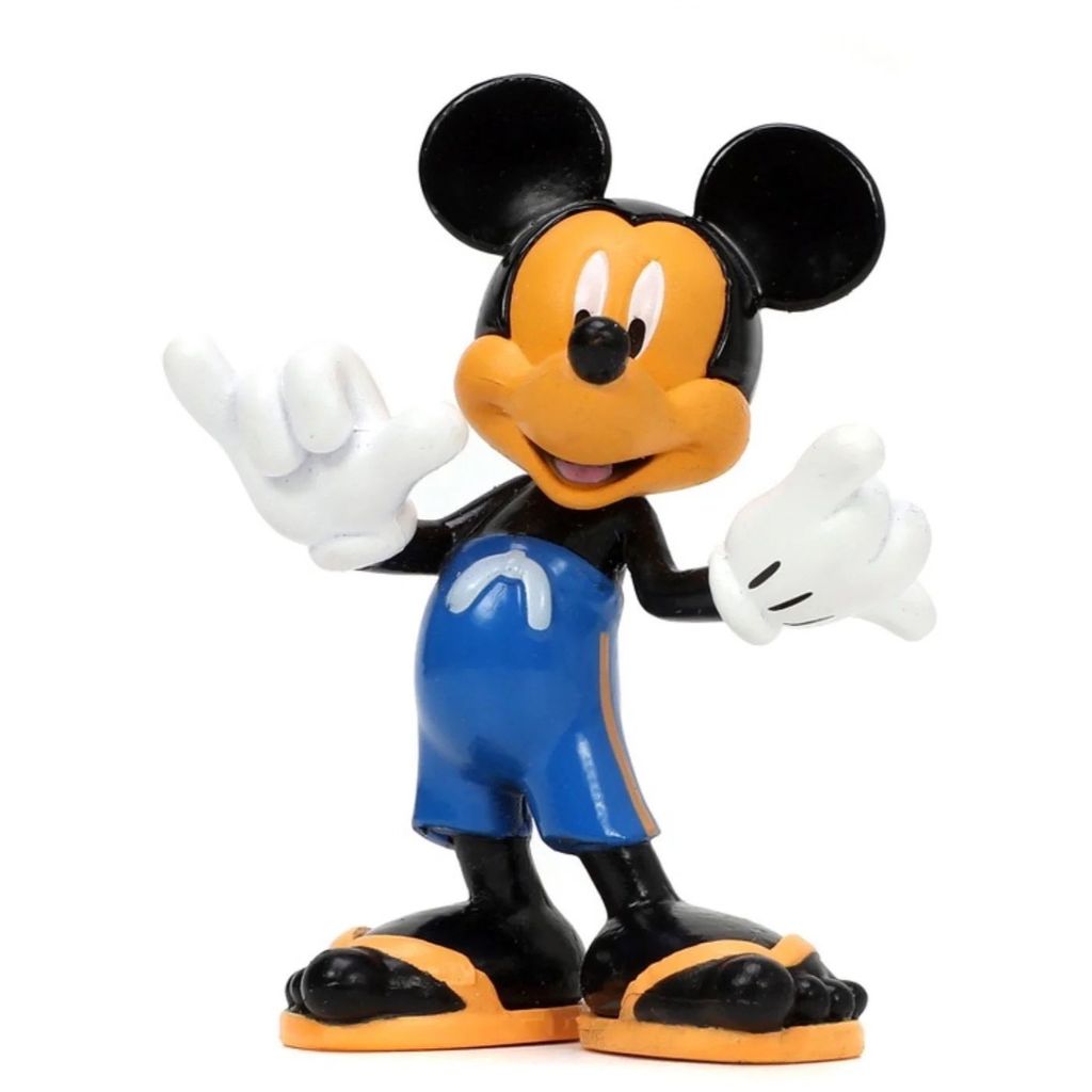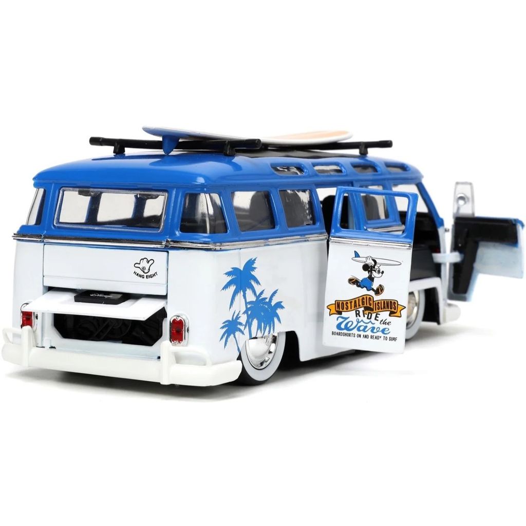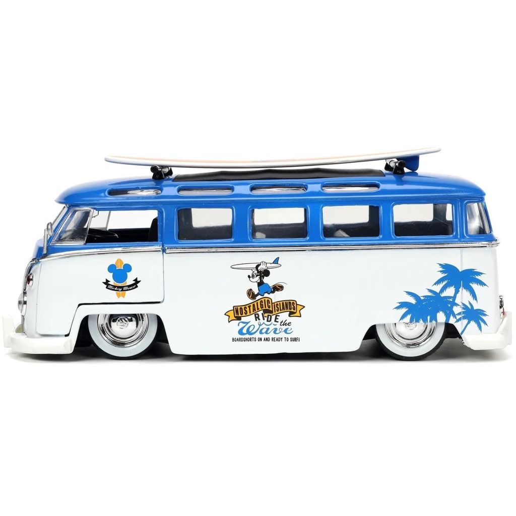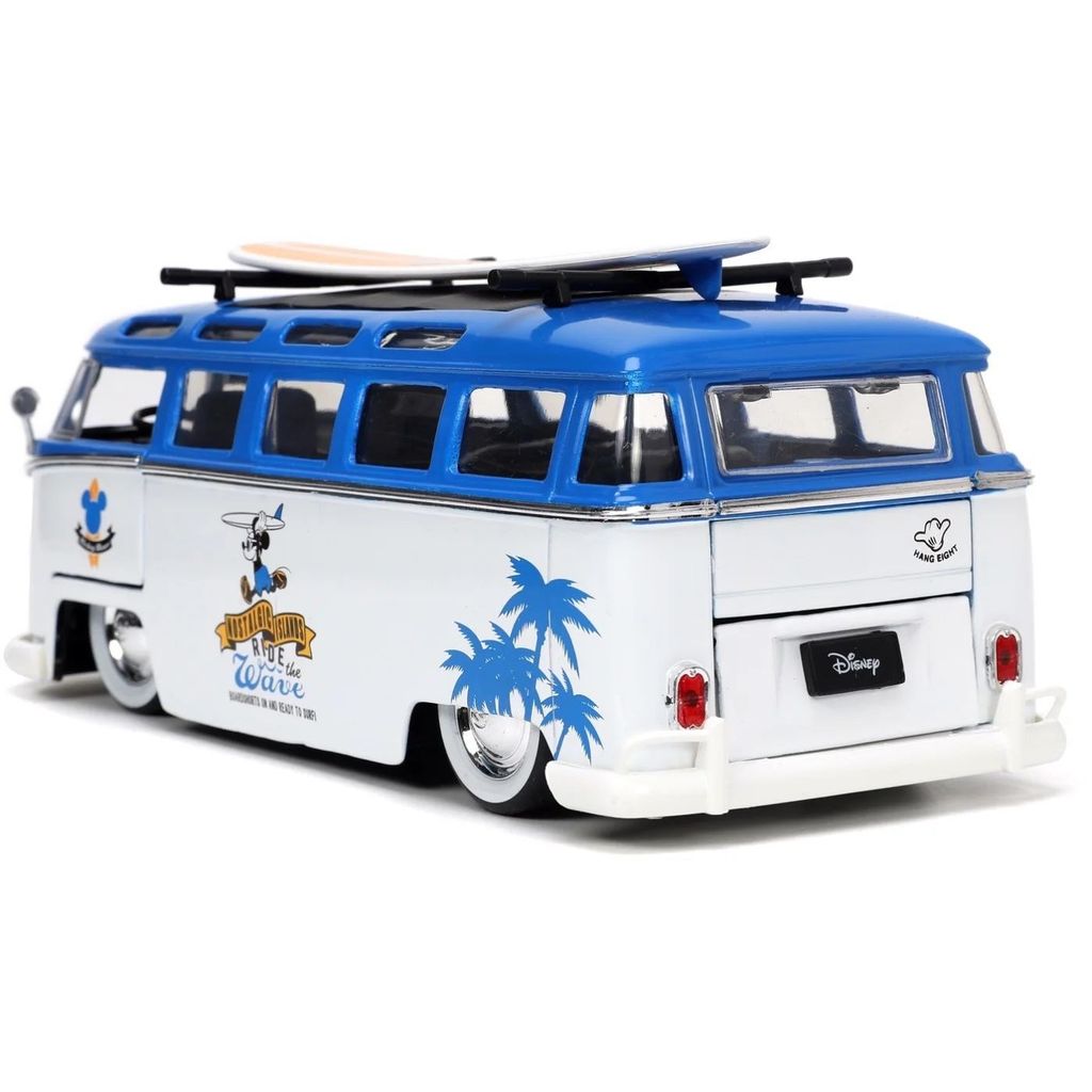 Mickey Mouse, eller Mickey Mouse, sammen med en hvid og blå Volkswagen T1 Bus med aftageligt surfbræt på taget. Bilen er i skala 1:24 og er ca. 20 cm lang.
