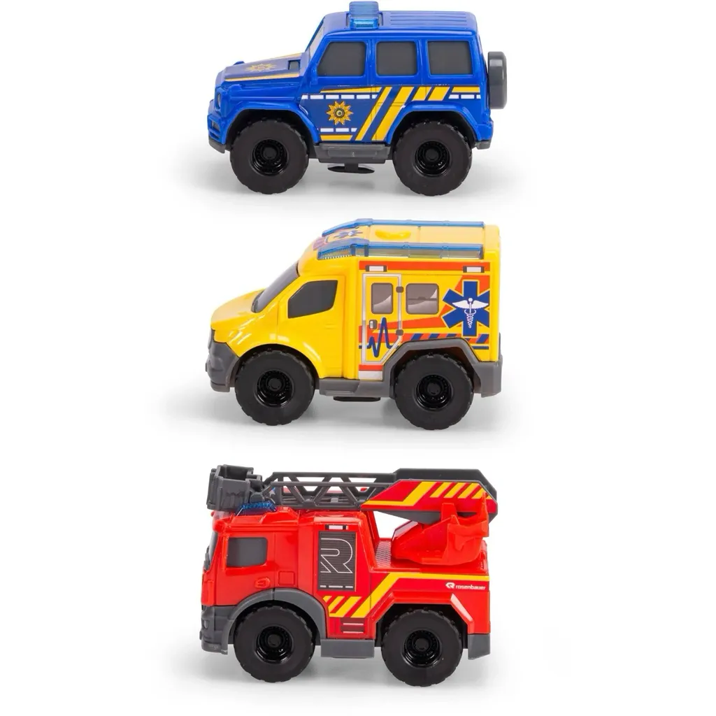 Bilerne er en politibil, en brandbil og en ambulance og er alle fra Mercedes-Benz. Bilerne er i mikrostørrelse og cirka 8 centimeter lange.