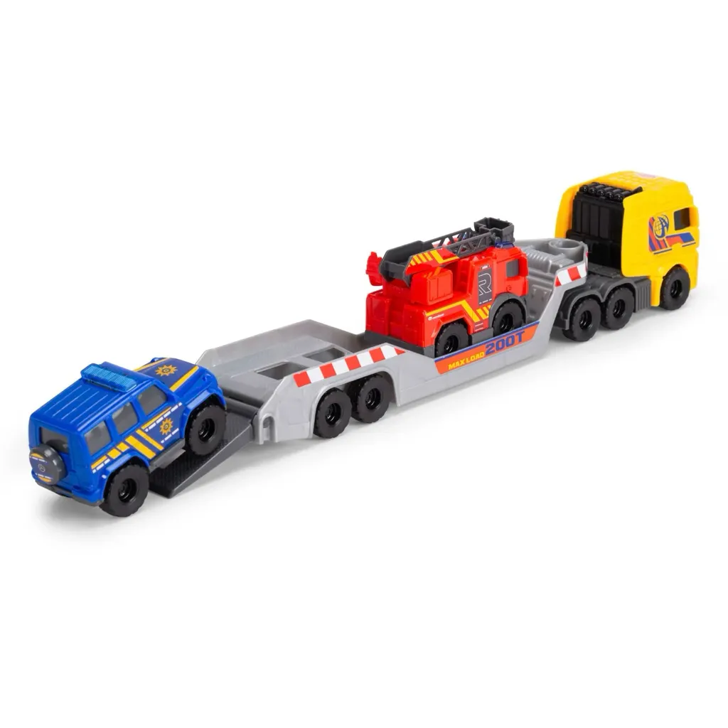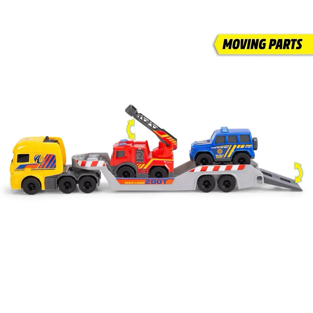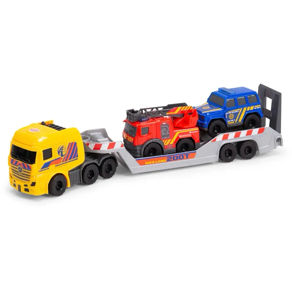 Micro Rescue Truck fra Dickie Toys er en biltransport, hvor en gul trækker trækker en trailer med en brandbil (stigevogn) og en politibil. Alle tre køretøjer er Mercedes-Benz.