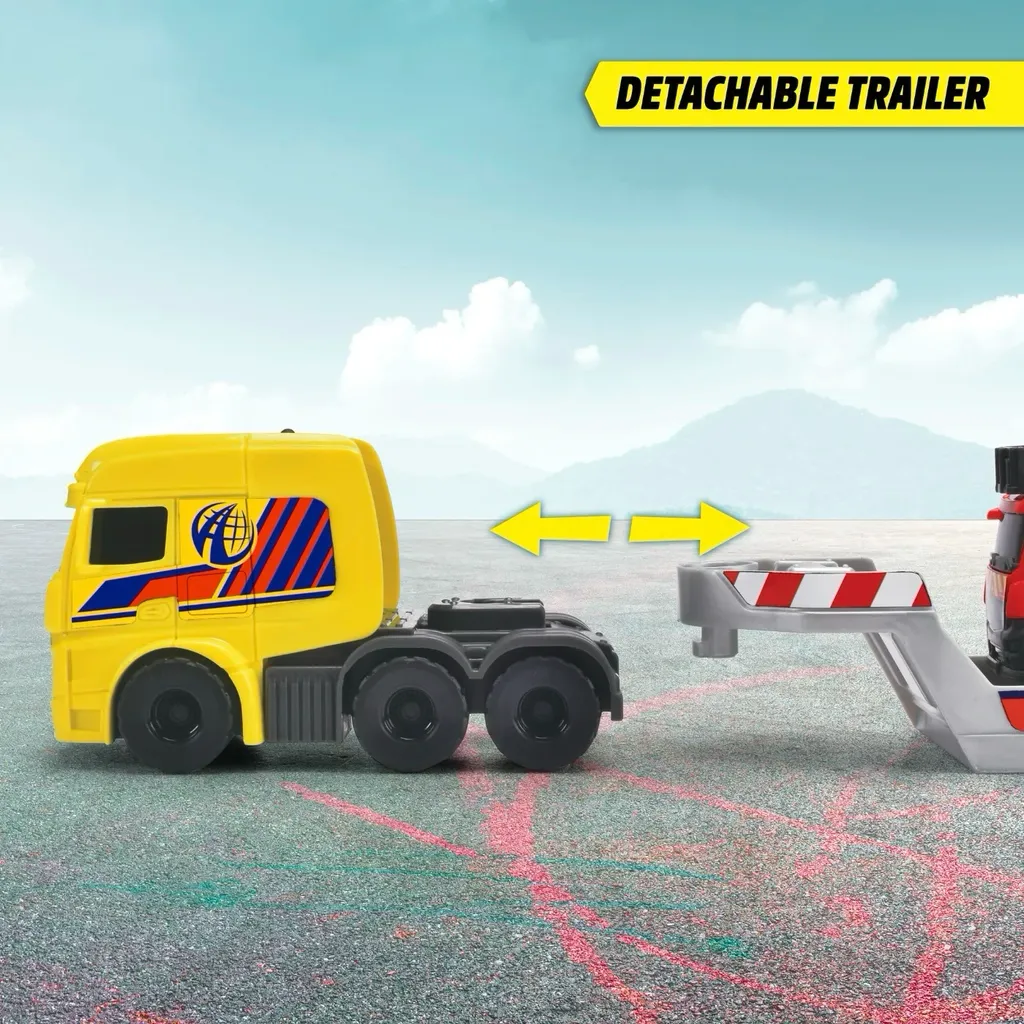 Trækvognen med anhænger er 31 cm lang, og bilerne på anhængeren er ca. 8 cm lange. Trailerens rampe kan foldes op og ned.