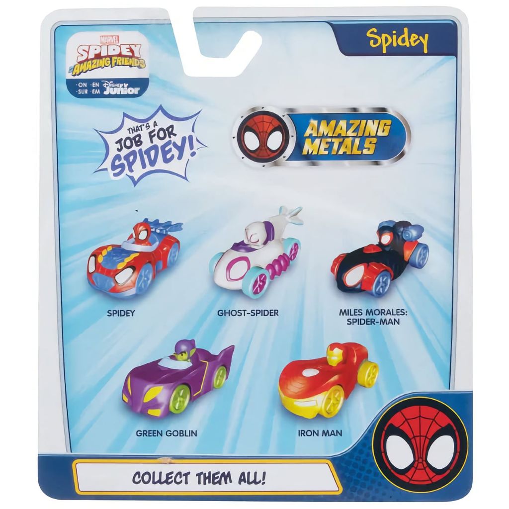 Miles Morales sidder i en sort legetøjsbil, der er 7,3 cm lang. Bilen er en del af Amazing Metals-serien fra Jazwares og Disney Junior.
