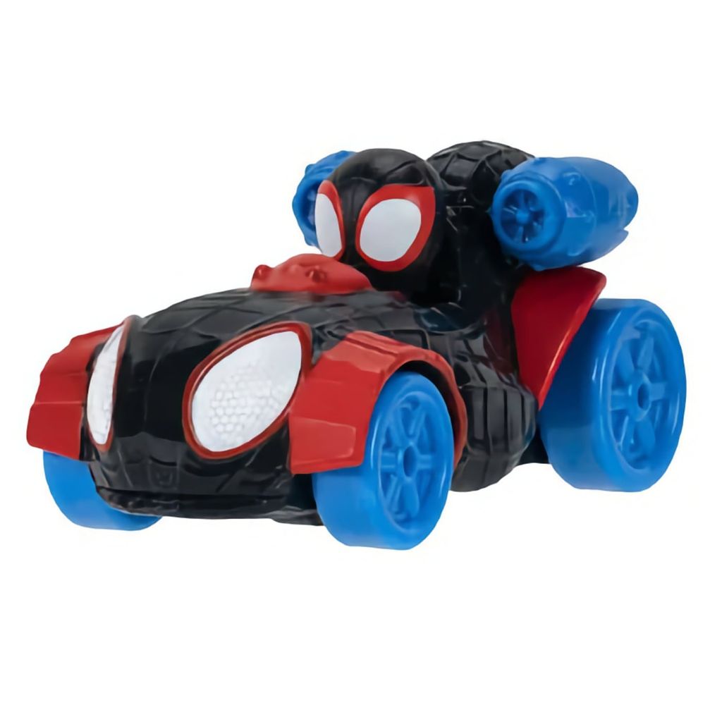 Miles Morales: Spider-Man fra Marvel-serien Spidey and his Amazing Friends. Miles Morales sidder i en sort legetøjsbil.