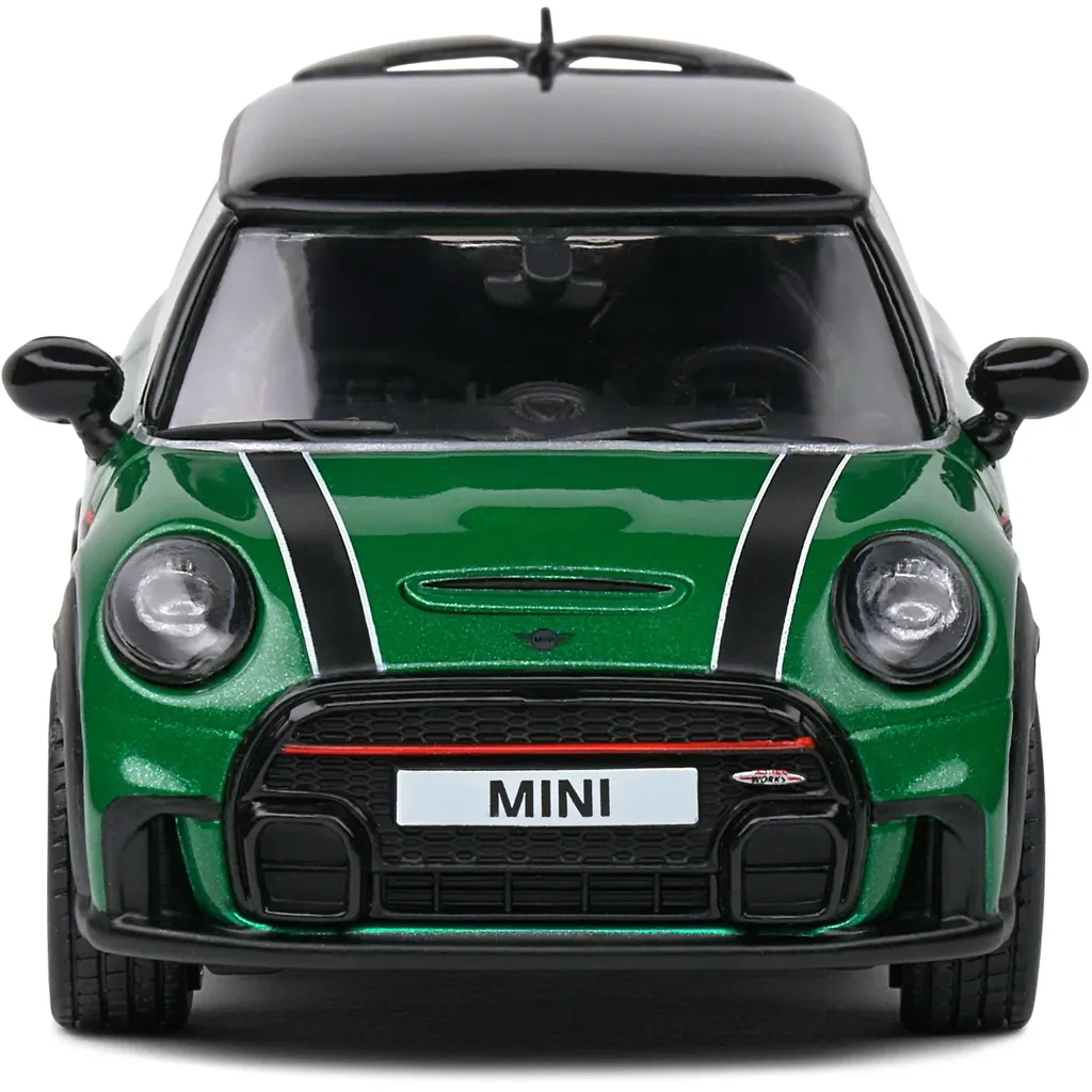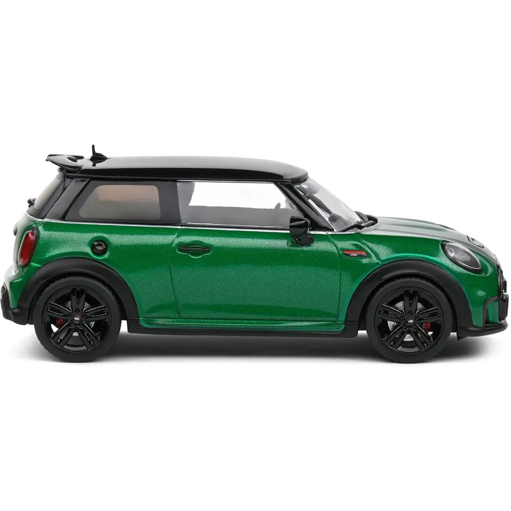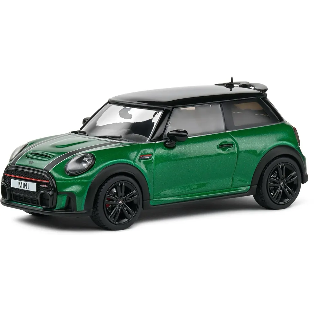 Mini Cooper John Works (F56), modelår 2023, som modelbil fra franske Solido. Modellen er lavet i skala 1:43, hvilket for denne model er 9 cm Mini. Farven er grøn (Racing Green).