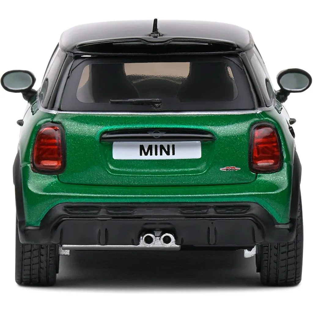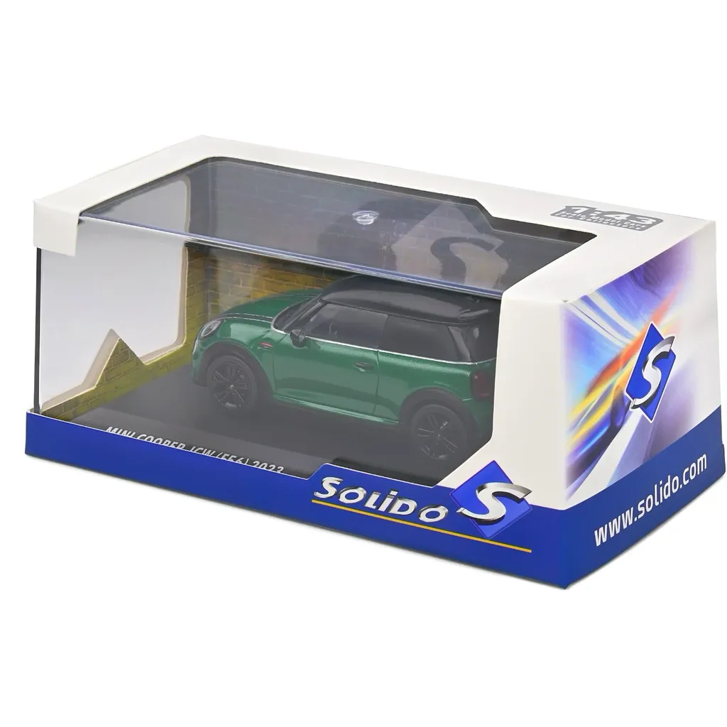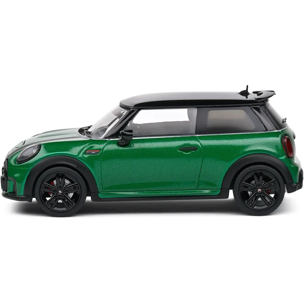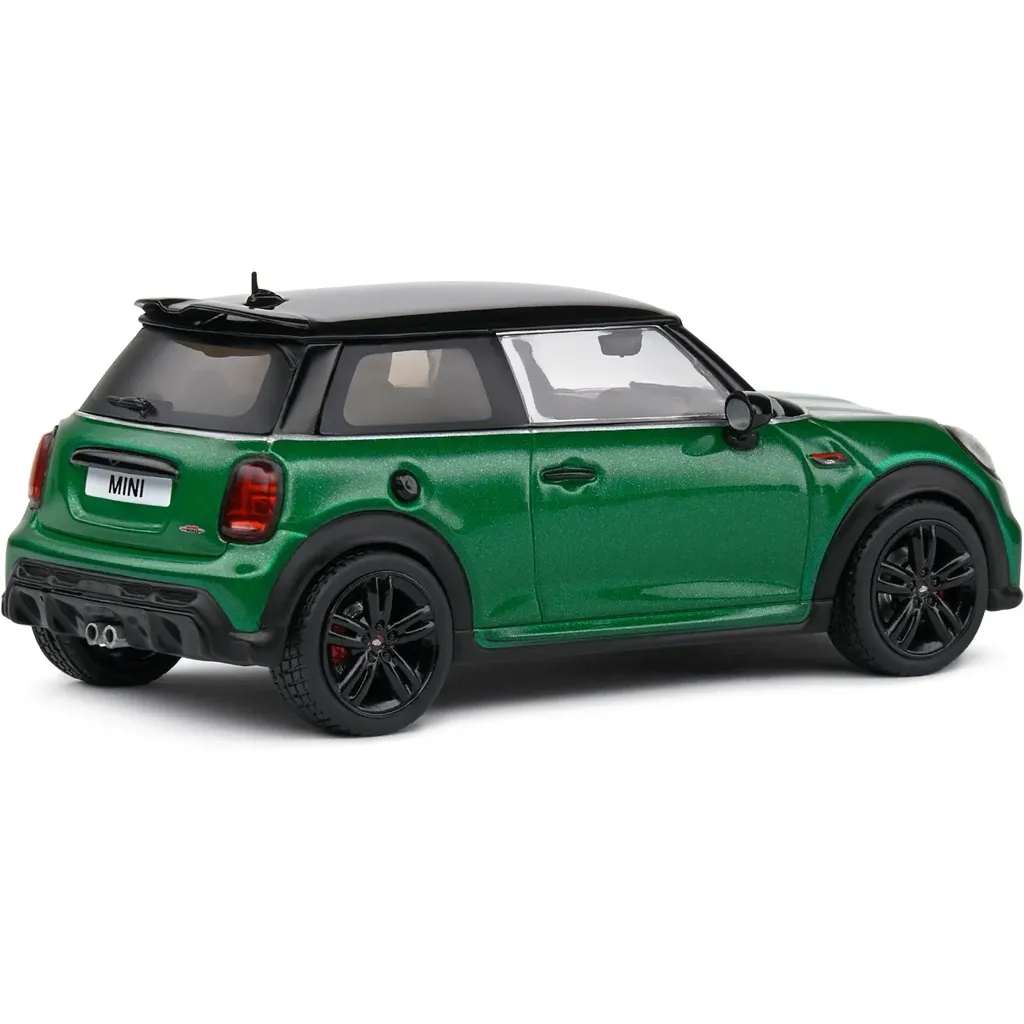 Mini Cooper John Works (F56), modelår 2023, som modelbil fra franske Solido. Modellen er lavet i skala 1:43, hvilket for denne model er 9 cm Mini. Farven er grøn (Racing Green).