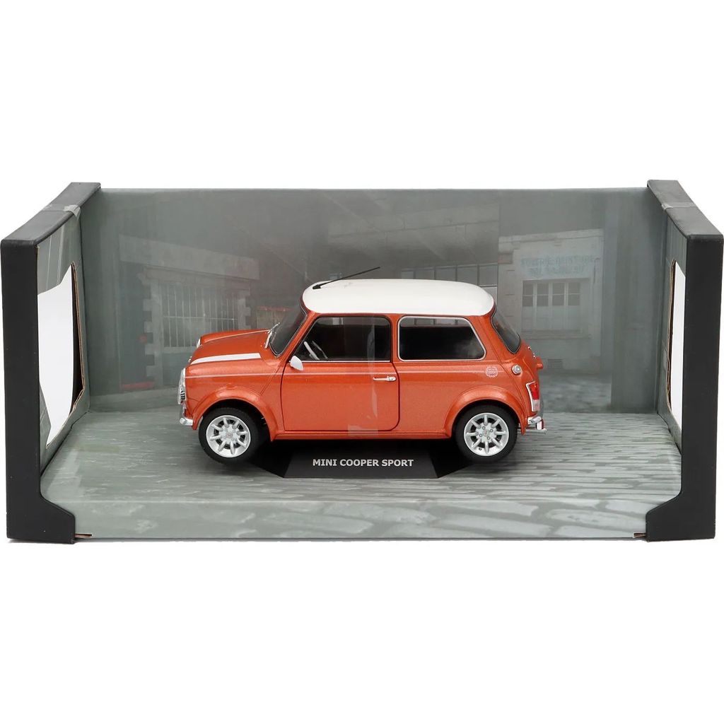 Fra franske Solido tilbyder vi denne orange (med hvidt tag) Mini Cooper Sport model årgang 1997 i skala 1:18 (16,5 cm).