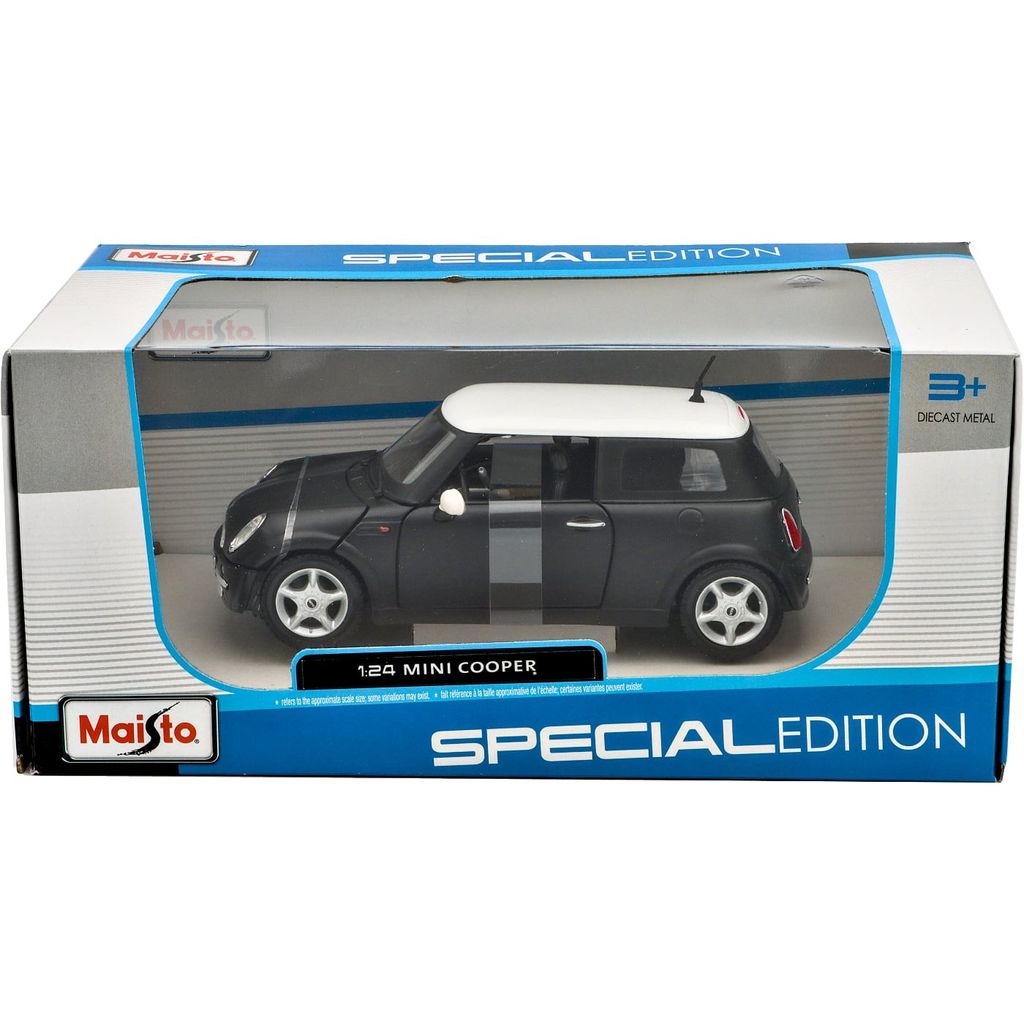 Sort (matlakering med hvidt tag) Mini Cooper modelbil fra Maisto i skala 1:24 (15 cm).