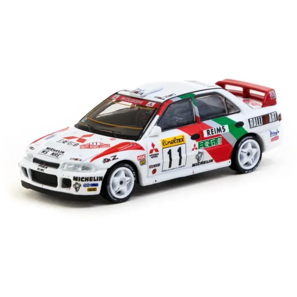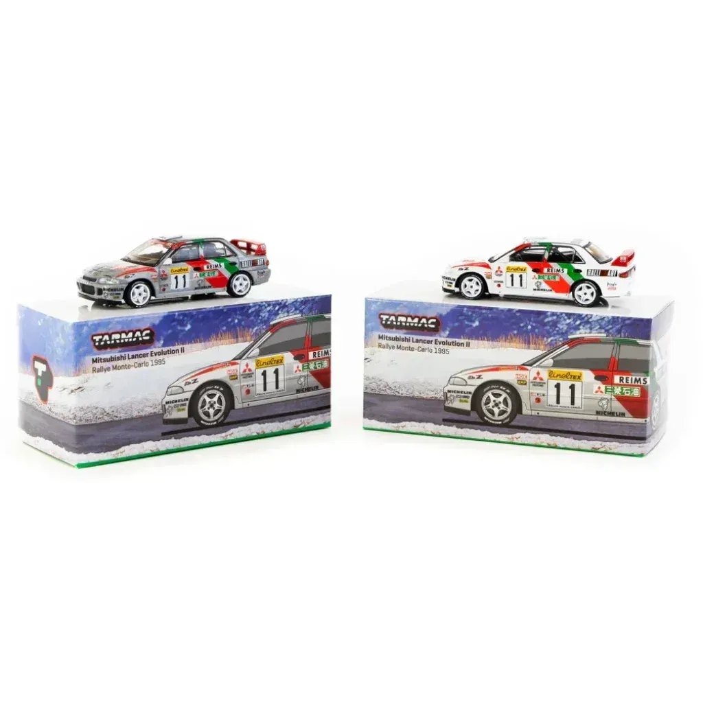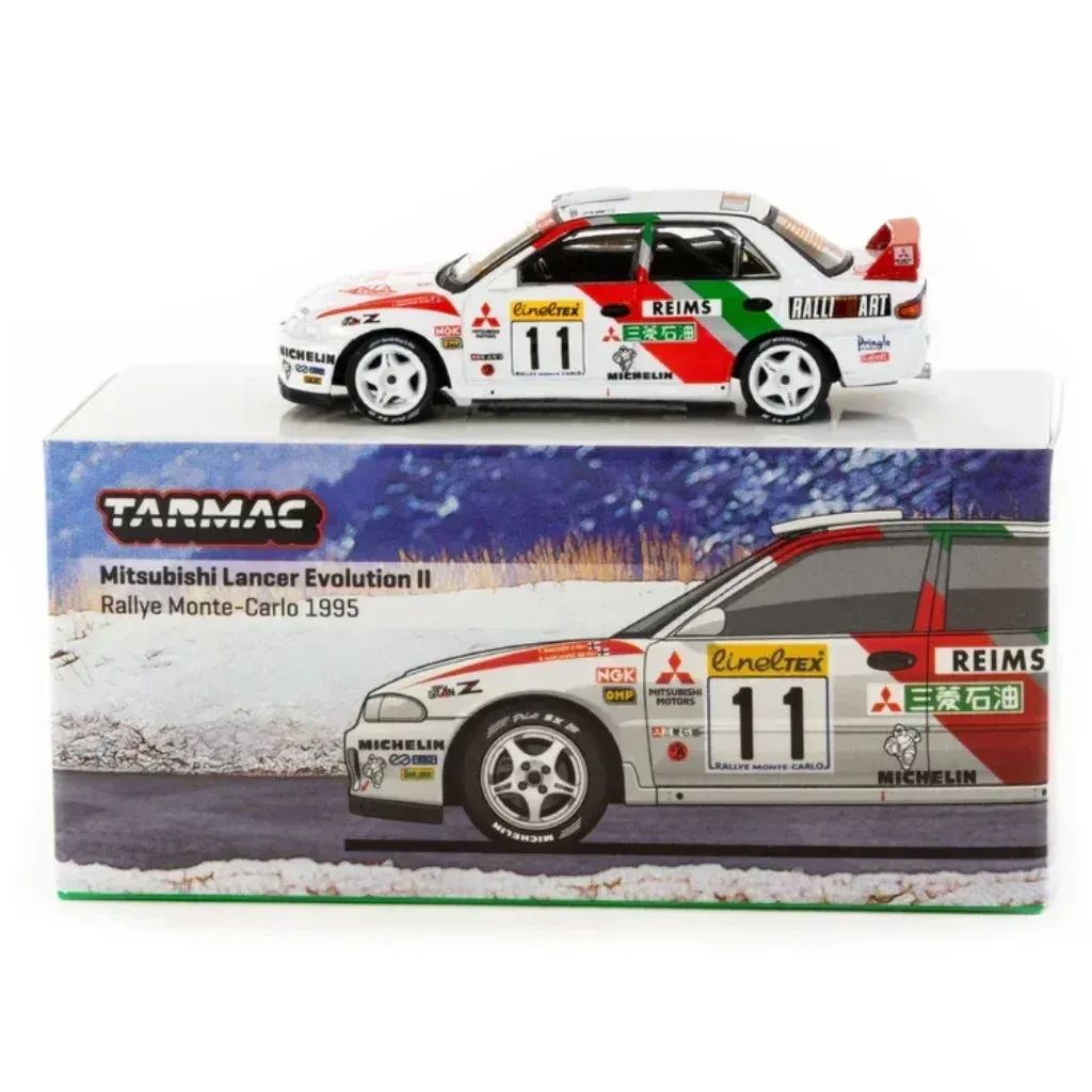 Mitsubishi Lancer Evolution II Rallye Monte-Carlo 1995 fra modelbilproducenten Tarmac Works. Denne model er en del af Tarmacs GLOBAL64-serie, og skalaen er 1:64, hvilket i dette miniformat kan oversættes til ca. 7 cm.