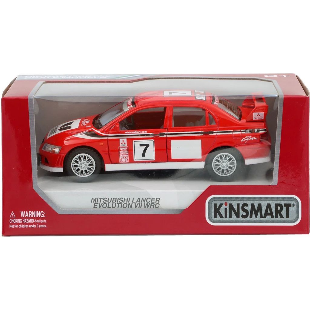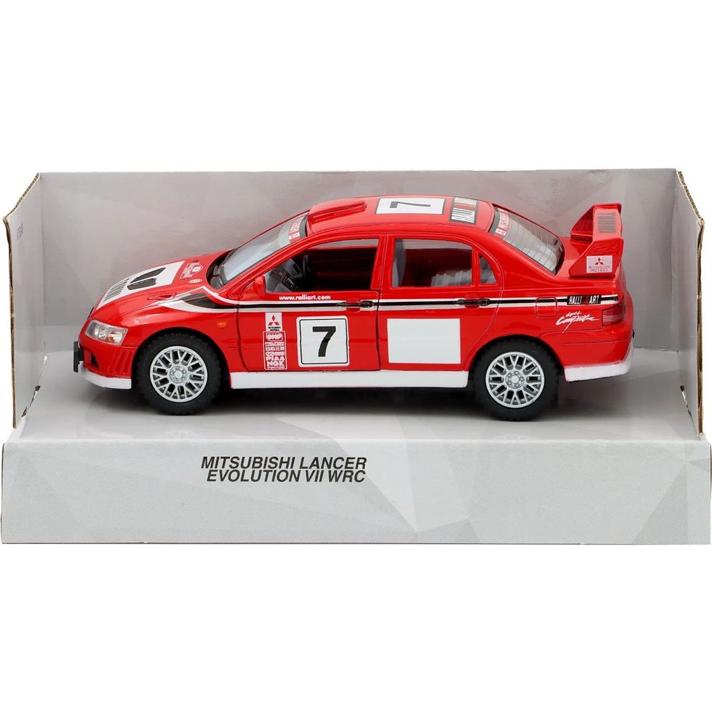Mitsubishi Lancer Evolution VII WRC fra Kinsmart i skala 1:40 (længde 13 cm).