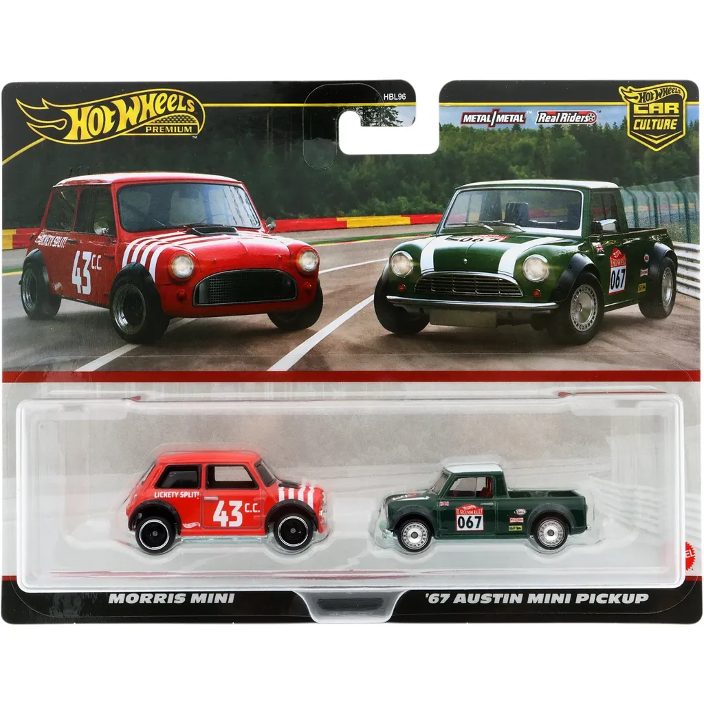 2-pak med en rød Morris Mini og en grøn Austin Mini Pickup fra 67 fra Hot Wheels og Car Culture-serien.
