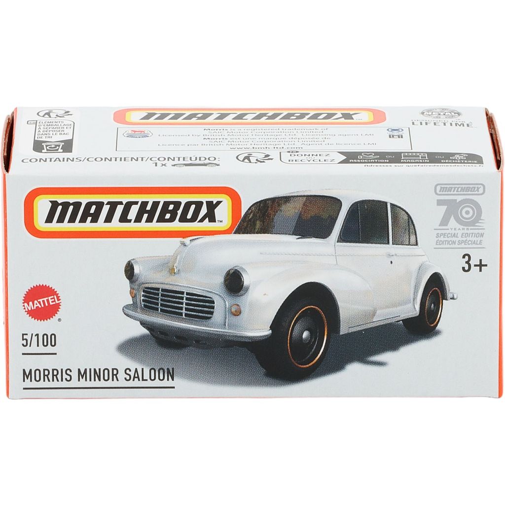 Hvid Morris Minor Saloon fra Matchbox og Power Grab-serien, hvor denne legetøjsbil er bil nummer 5/100.