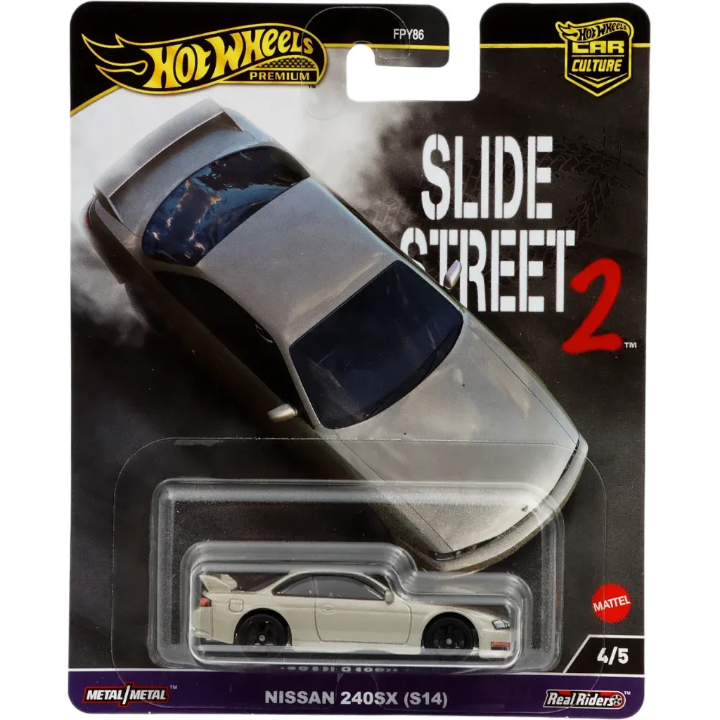 Nissan 240SX (S14) fra Hot Wheels Premium og serien Car Culture: Slide Street 2 fra 2024, hvor denne S14 er bil nummer 4 ud af 5 i serien.