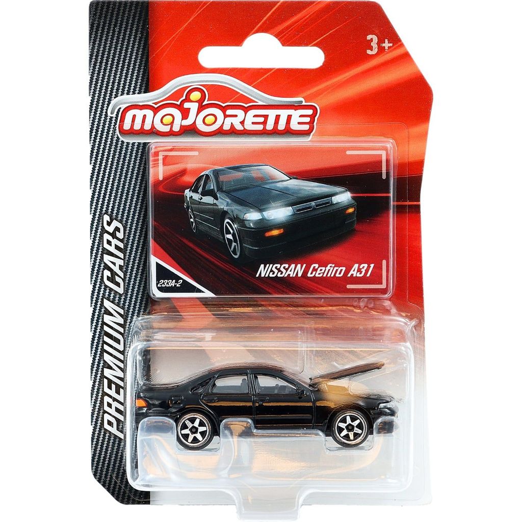 Sort Nissan Cefiro A31 fra Majorette og Premium Cars-serien. Skalaen er 1:58, hvilket giver os en Nissan Cefiro på ca. 7,5 cm.