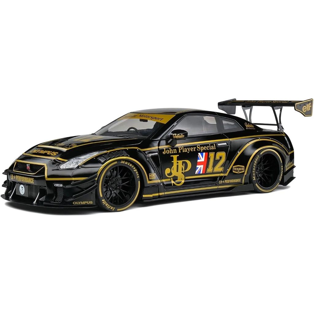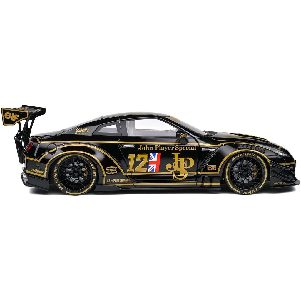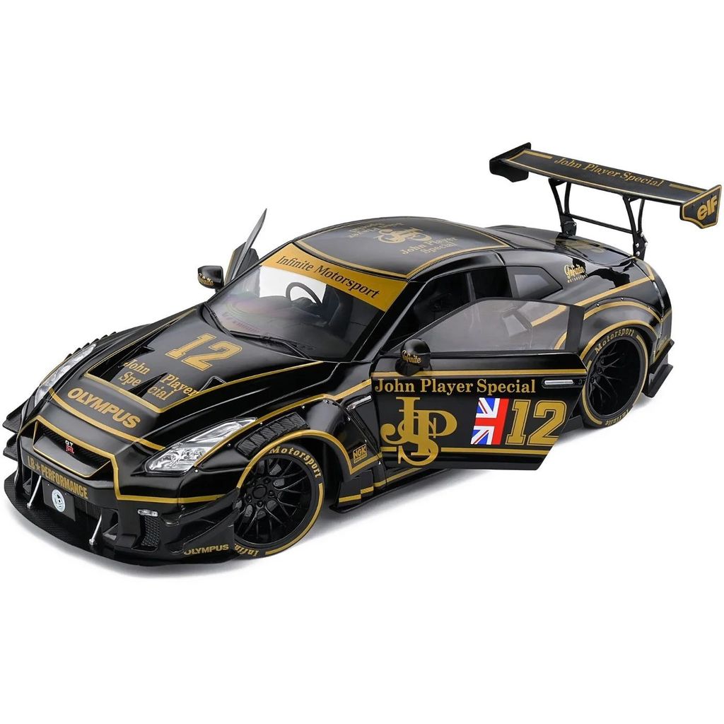 Modelbil fra Solido, hvor en sort Nissan GT-R (R35) med Liberty Walk-karosseri og John Player Special-lakering er blevet modelleret. Skalaen er 1:18 (27 cm).