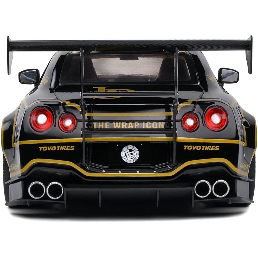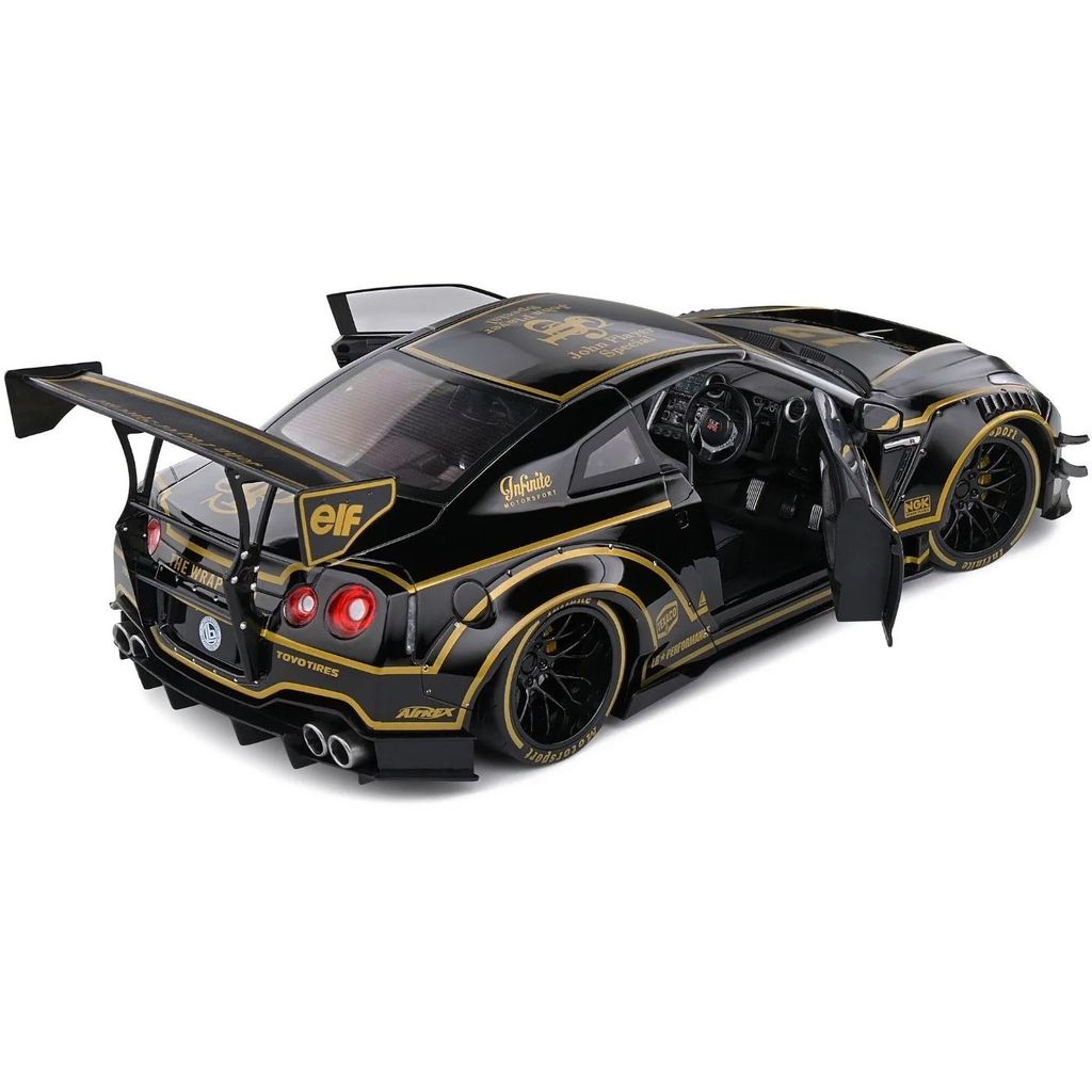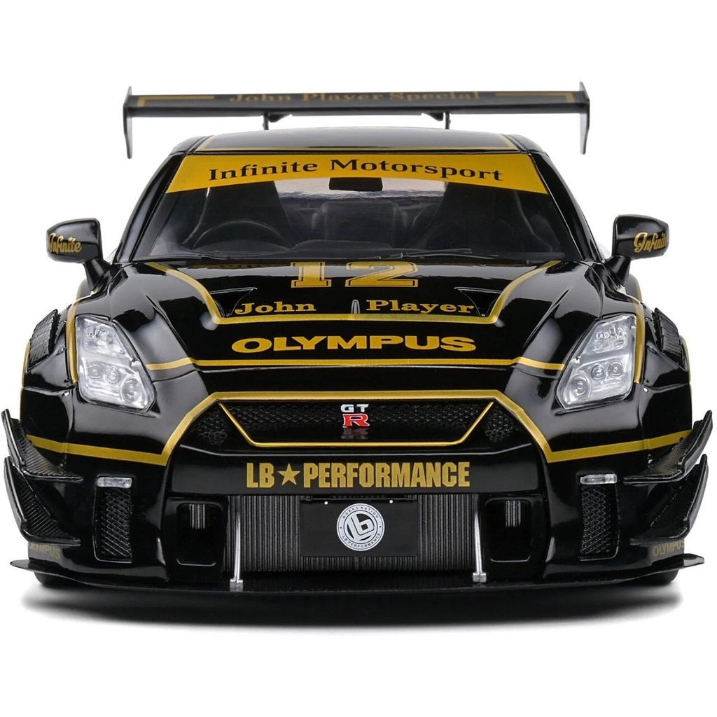 Modelbil fra Solido, hvor en sort Nissan GT-R (R35) med Liberty Walk-karosseri og John Player Special-lakering er blevet modelleret. Skalaen er 1:18 (27 cm).