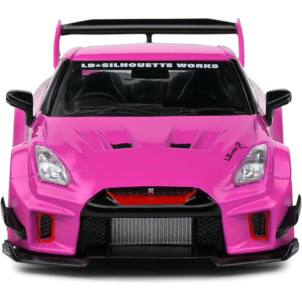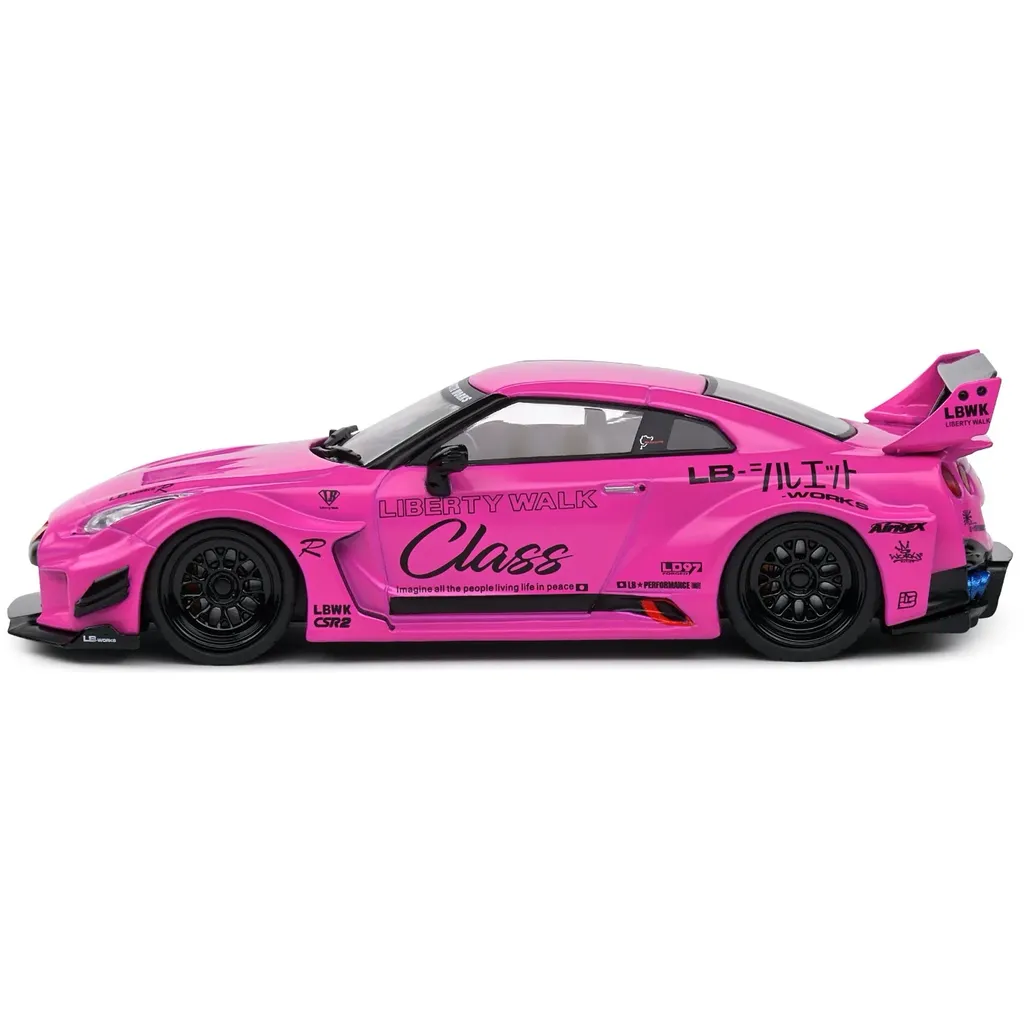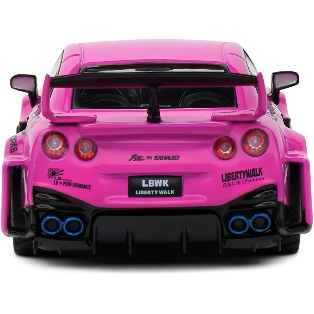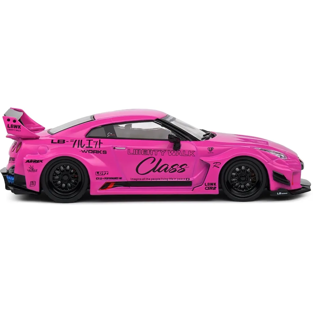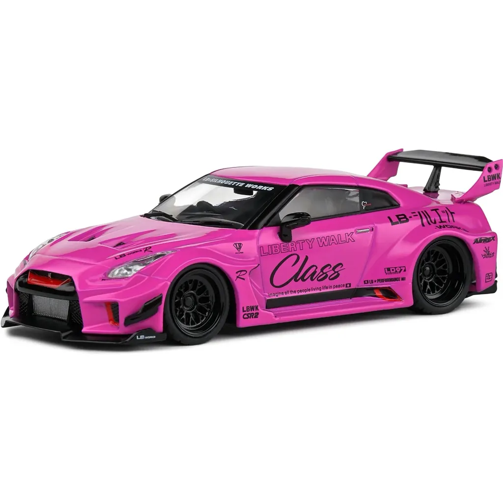 Nissan GT-R (R35), modelår 2019, som modelbil fra franske Solido. Modellen er lavet i skala 1:43, som for denne model er 11 cm Mini. Farven er pink, og karrosseriet er udstyret med et bodykit fra det japanske firma Liberty Walk (LWBK).
