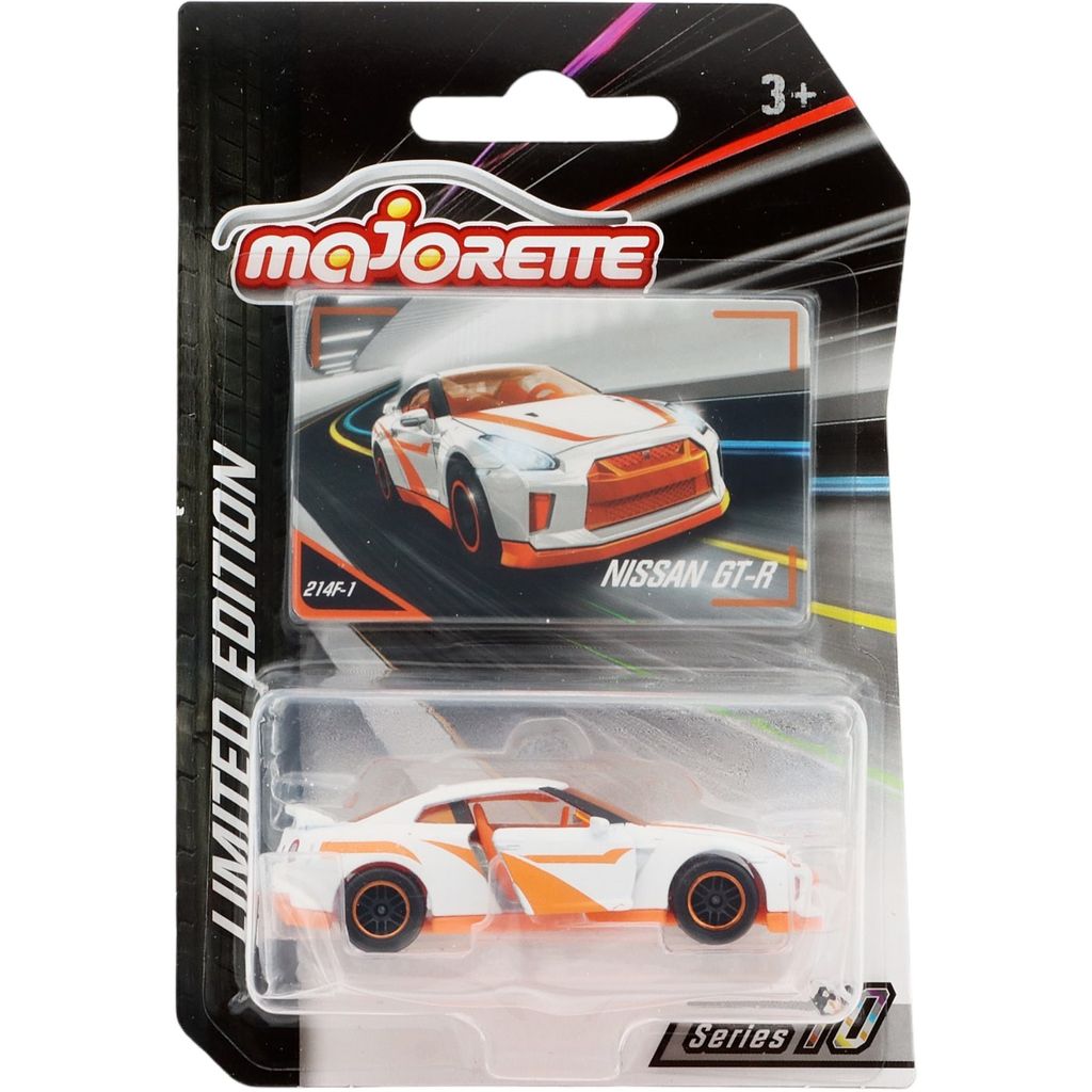 Hvid og orange Nissan GT-R legetøjsbil fra Majorette og Limited Edition Series 10-serien.