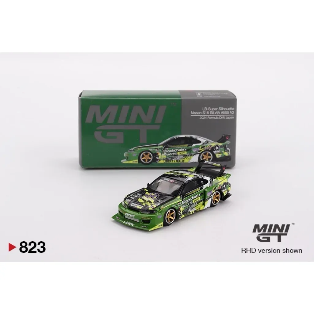 LB-Super Silhouette Nissan S15 SILVIA #555 V2 2024 Formula Drift Japan som modelbil fra Mini GT i skala 1:64 (ca. 7 cm). Bilen er grøn med et bodykit fra Liberty Walk.