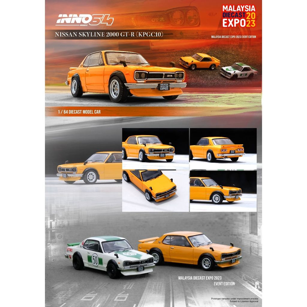 Modellens fulde navn er "Nissan Skyline 2000 GT-R (KPGC10) Malaysia Diecast Expo 2023 Event Edition Orange" og varenummer "IN64-KPGC10-MDX230R".