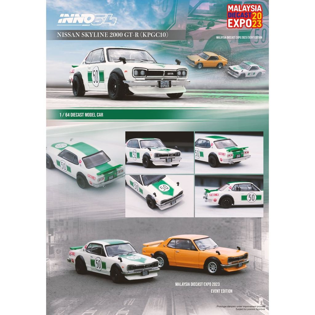 Modellens fulde navn er "Nissan Skyline 2000 GT-R (KPGC10) Malaysia Diecast Expo 2023 Event Edition White" og varenummer "IN64-KPGC10-MDX23WH".