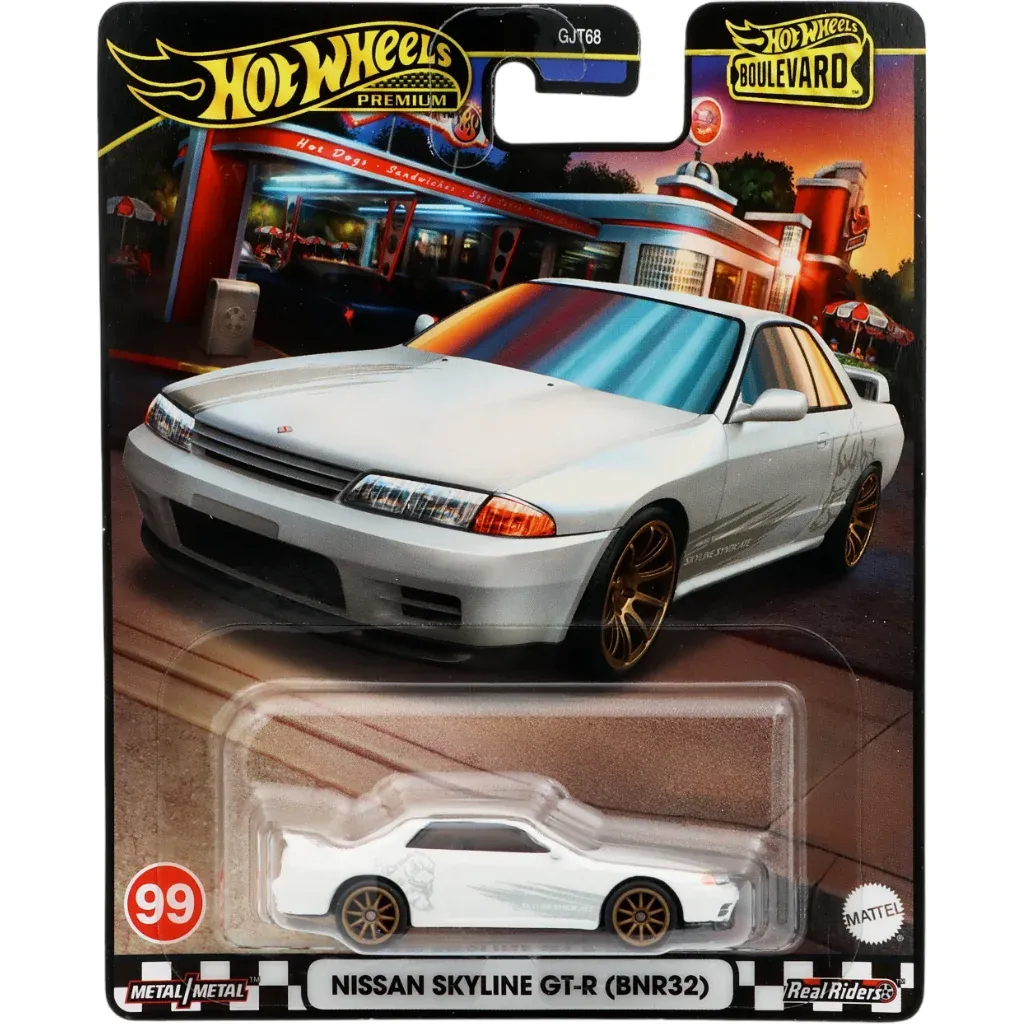 Nissan Skyline GT-R (BNR32) fra Hot Wheels Premium og Boulevard Mix 2-serien fra 2024, hvor denne Skyline er bil nummer 99 i Boulevard-serien.