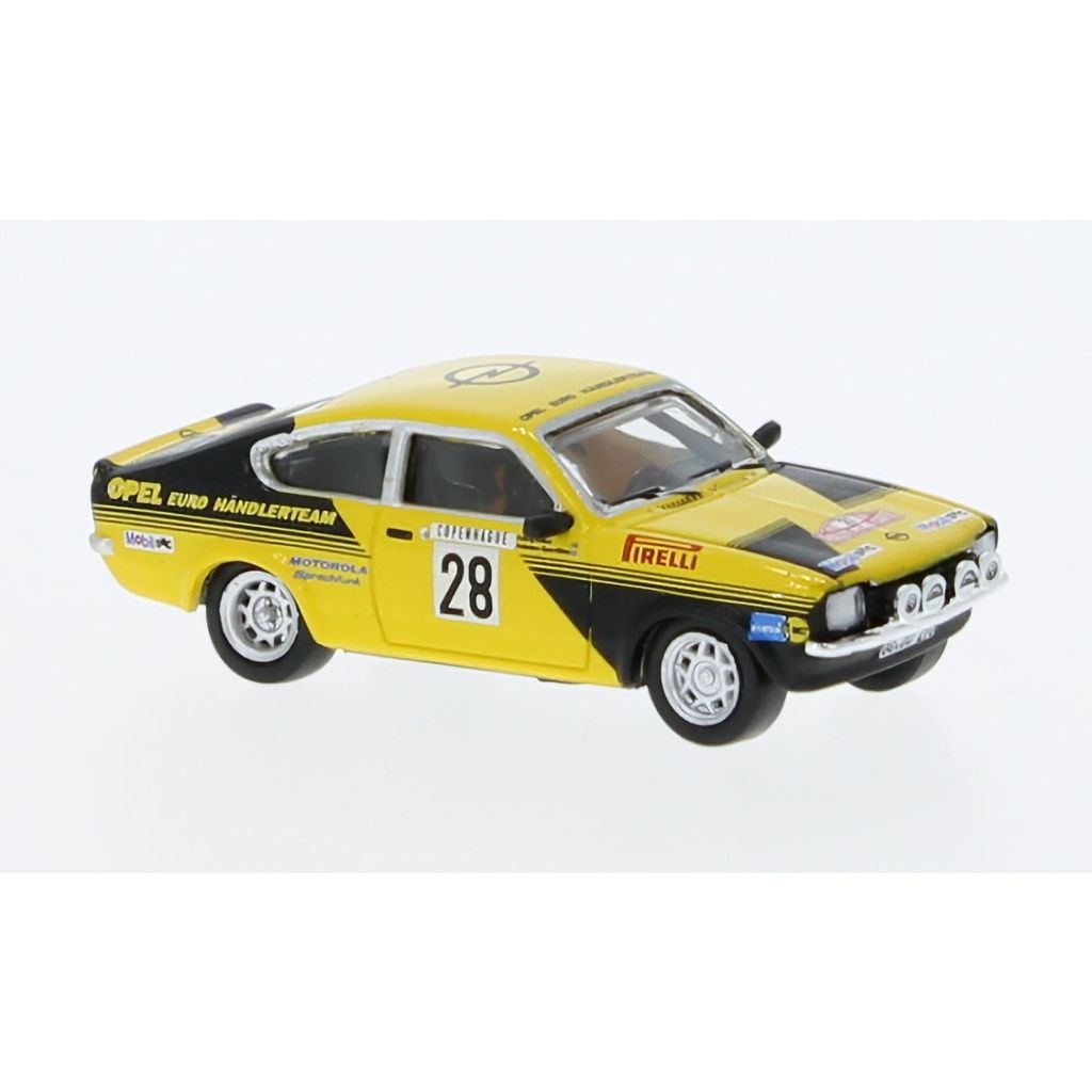 Opel Kadett C GT/E-rallybilen, der kørte Monte Carlo Rally i 1976 med nummer 28. Modelbilen er i skala 1:87 (4,7 cm) og fremstillet af Brekina.