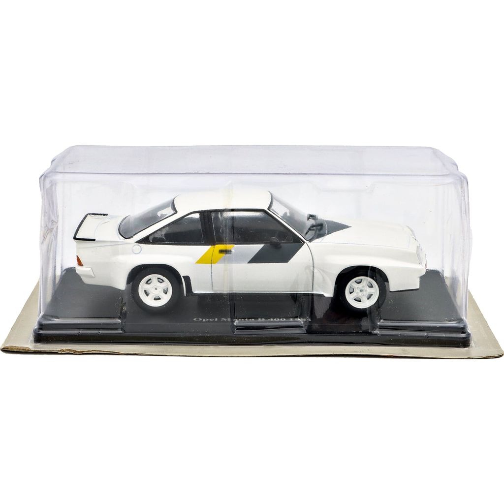 Opel Manta B 400, modelår 1981, fra Hachette Models i hvid lak med grå, sort og gul dekoration. Skalaen er 1:24 (18,5 cm). Bilen er en model til voksne samlere, ikke til leg.