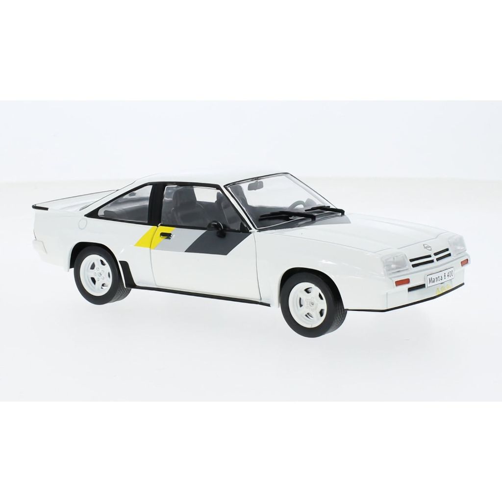 Opel Manta B 400 fra 1981 som modelbil. Hvid lak med gul, grå og sort dekoration.