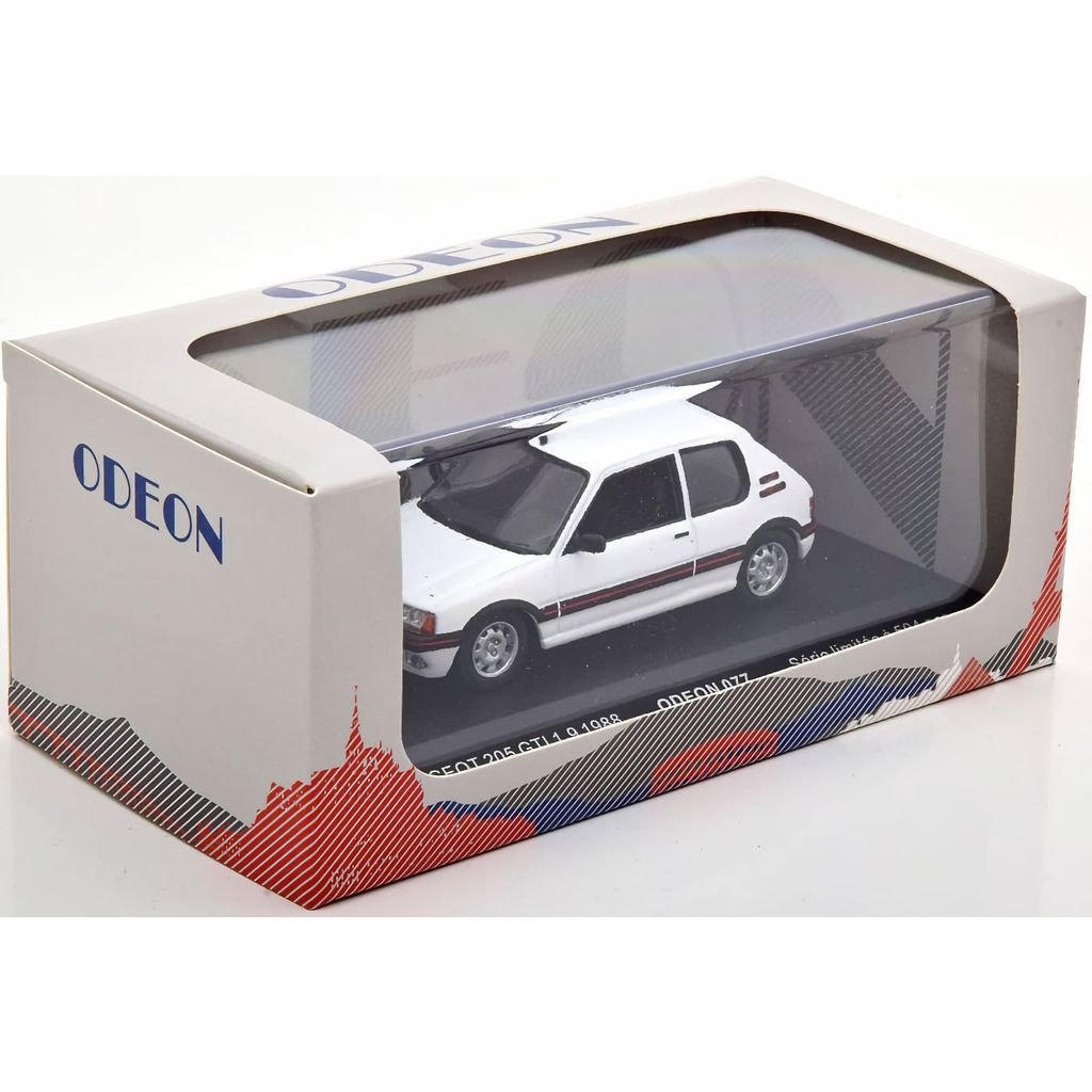 Modelbil fra Odeon i skala 1:43, hvor en hvid Peugeot 205 GTI 1.9 fra 1988 var modellen.
