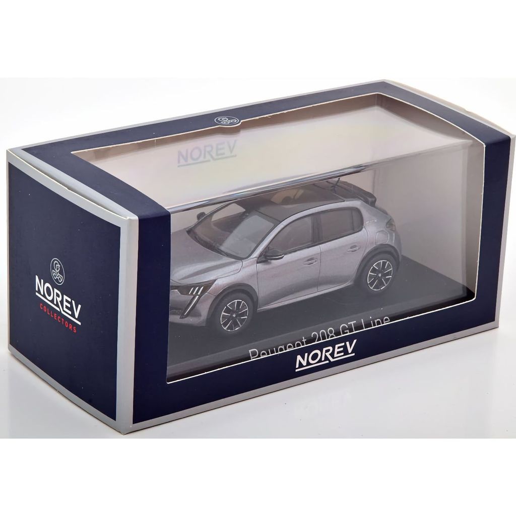 Gråmetallic Peugeot 208 GT Line modelår 2019 fra modelbilproducenten Norev i skala 1:43 (ca. 9,5 cm).