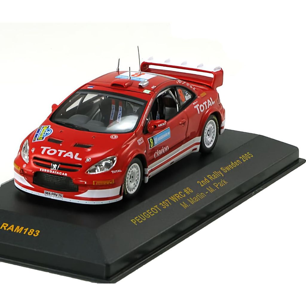 Modelbil fra Ixo Models i form af en Peugeot 307 WRC kørt af Markko Märtin og Michael Park (co-driver/co-driver) i det svenske rally (Rally Sweden) 2005. Modellen er i skala 1:43, hvilket svarer til ca. 10 cm rallybil i modelformat.