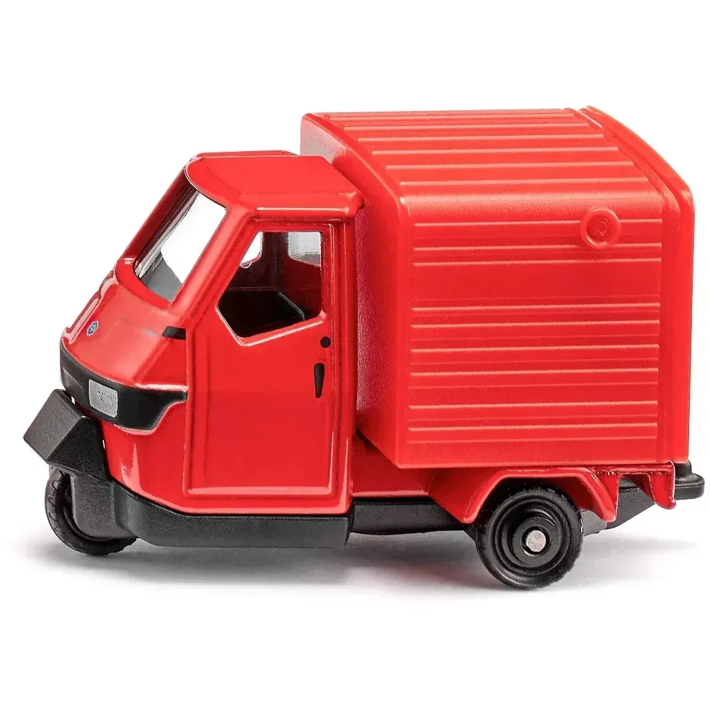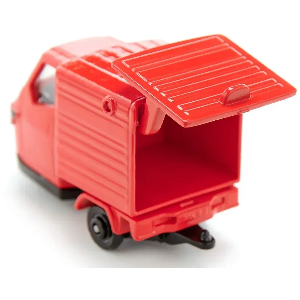 Piaggio Ape 50 knallertbil som legetøjsbil fra Siku. Knallertbilen er rød og har et kabinet, der kan åbnes.