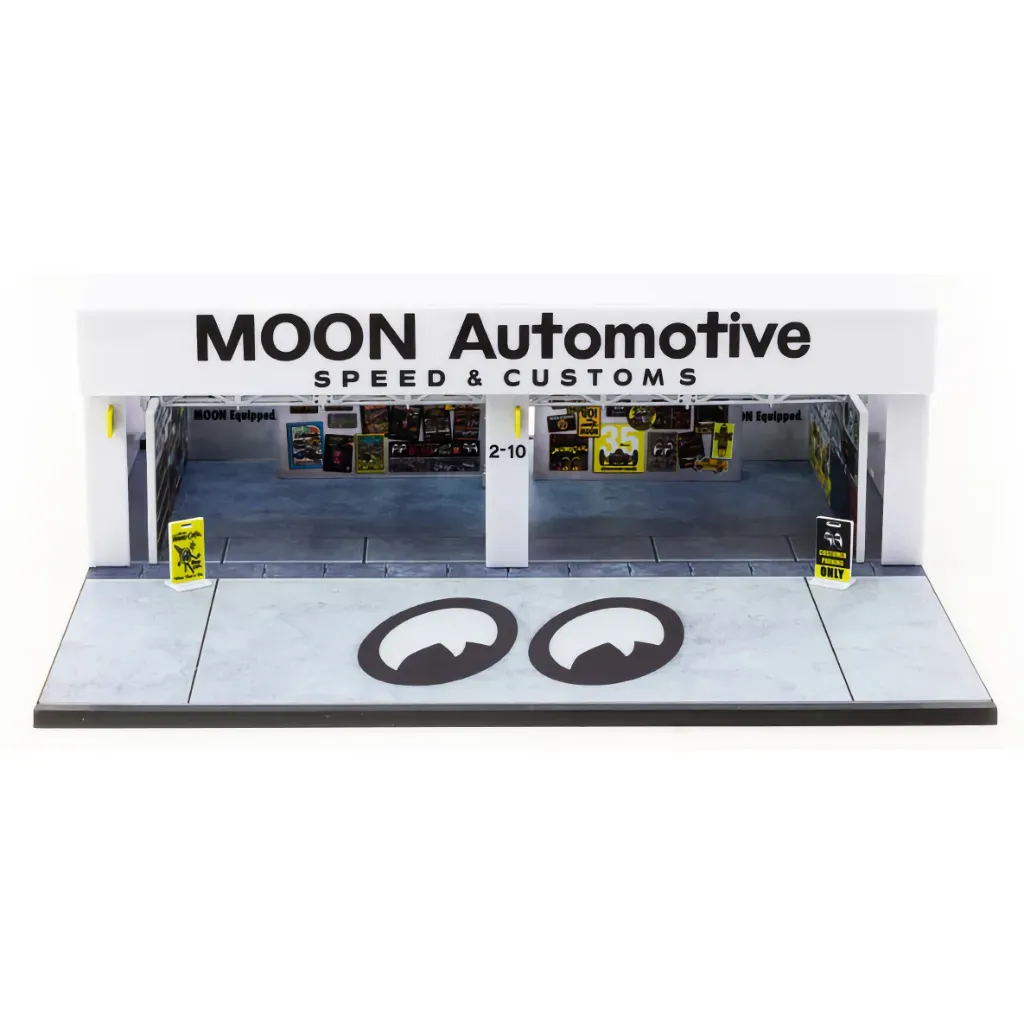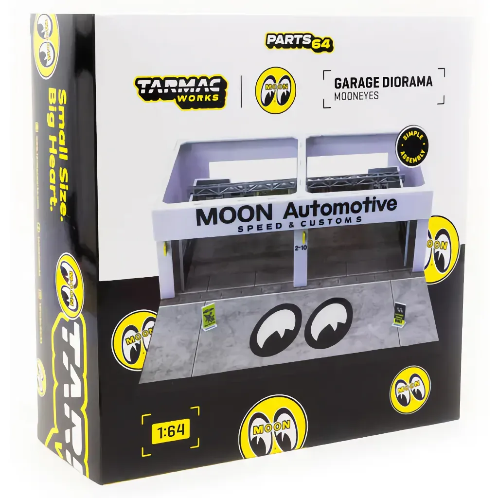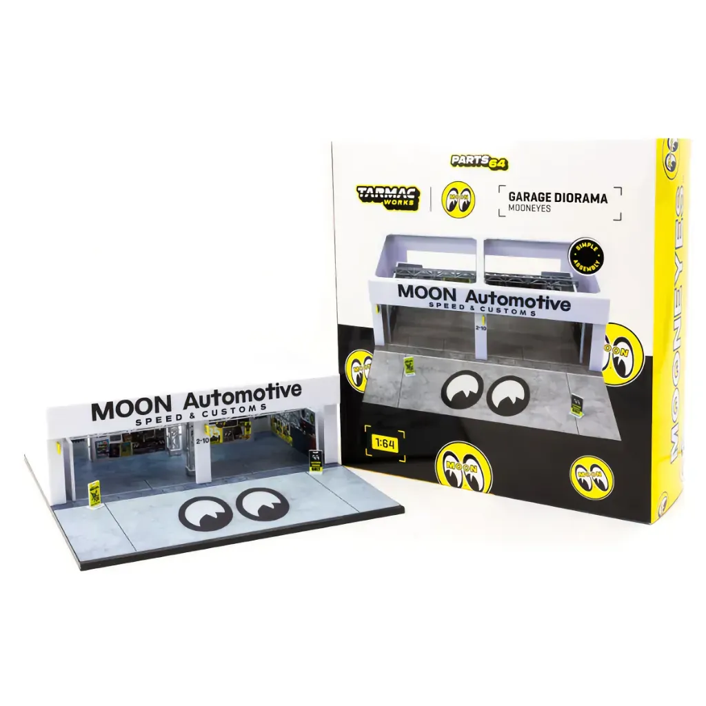 Pit Garage-diorama med Mooneyes-tema fra Tarmac Works og deres PARTS64-serie. Dioramaet er i skala 1:64 og anbefales fra 14 år og opefter.